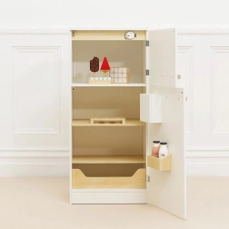 Questo frigorifero con congelatore per bambini, a libera installazione, porta un tocco autentico a ogni cucina gioco. Il design retrò, la solida struttura in legno e i dettagli ben studiati favoriscono il gioco di ruolo e la motricità fine. Il frigorifero è compatibile con la grande cucina LE TOY VAN e grazie alle porte magnetiche e agli accessori intrattiene i bambini per ore.