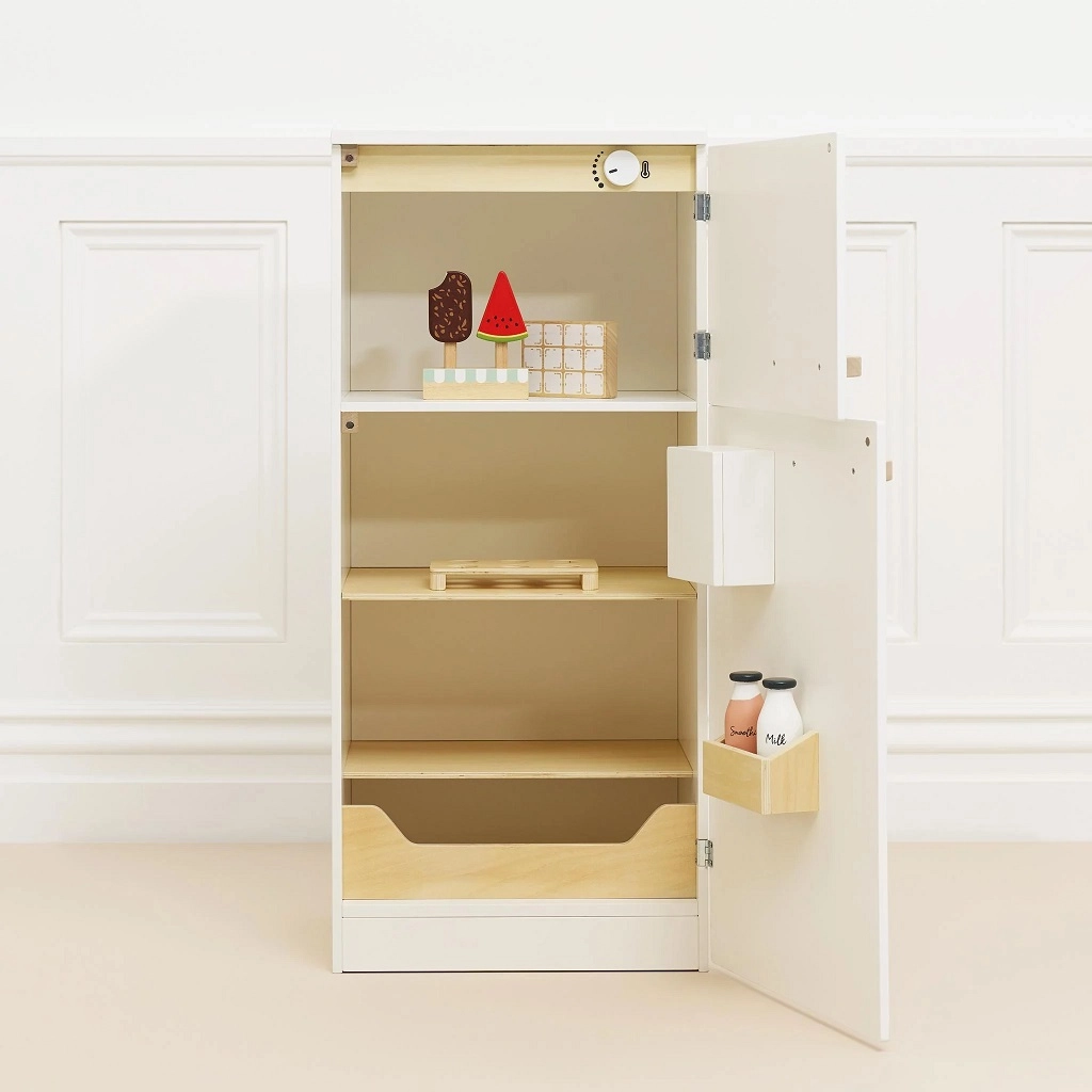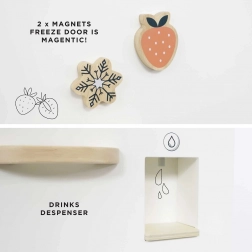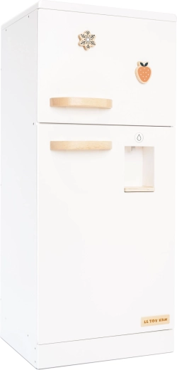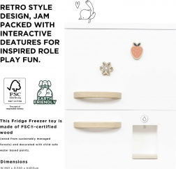 Migliora la cucina dei bambini con un elegante frigorifero con congelatore del marchio LE TOY VAN. Un resistente giocattolo in legno dal design retrò offre erogatore d'acqua integrato, controllo della temperatura, porte magnetiche e pratici scomparti per frutta e verdura. Il set include tanti accessori per un gioco creativo da piccoli professionisti in cucina. Realizzato in legno certificato FSC e verniciato con colori atossici a base d'acqua.