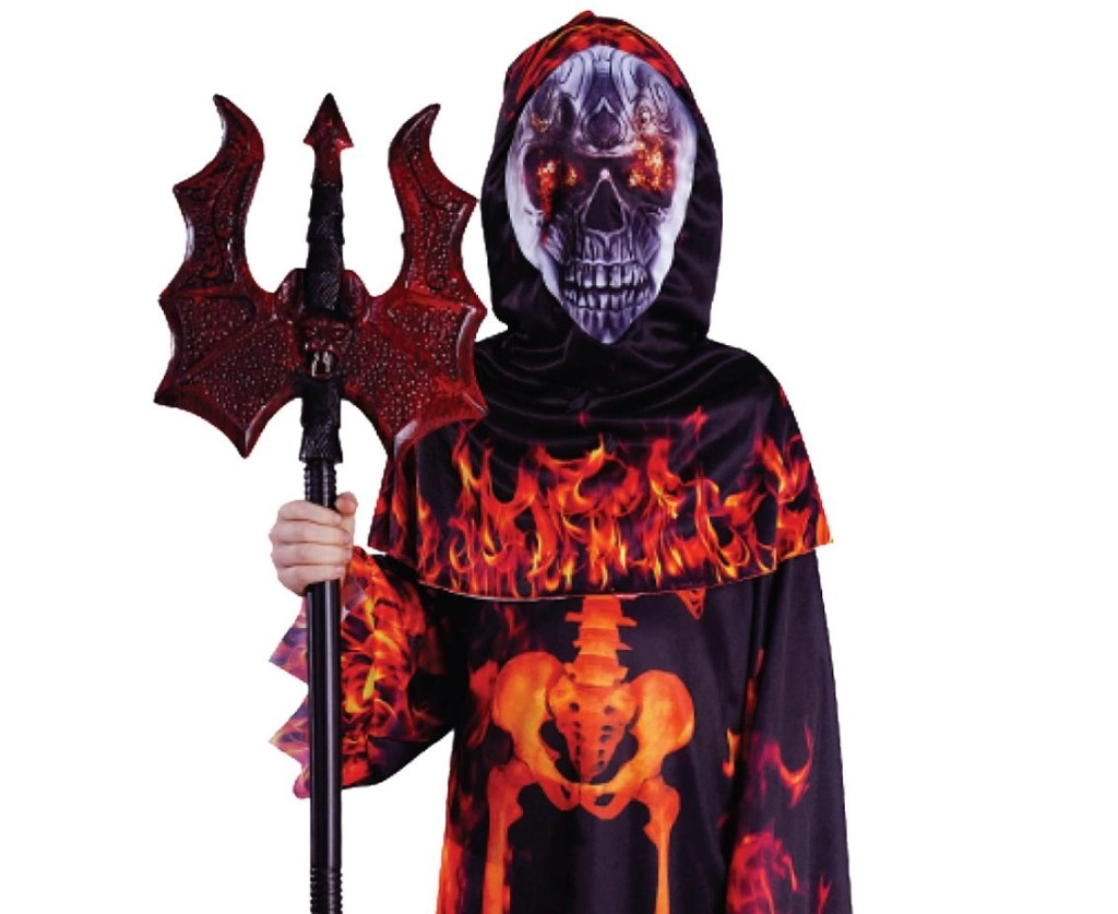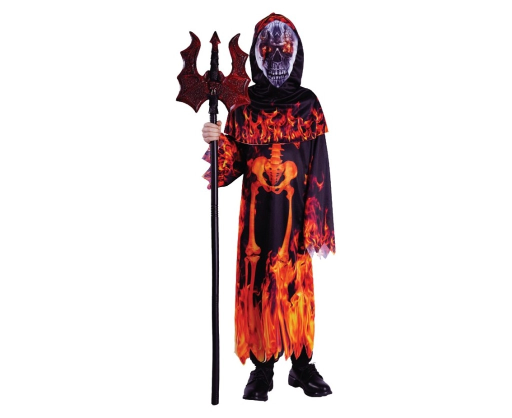 Elegante costume da diavolo con cappuccio per bambini in taglia universale 110–120 cm: una scelta perfetta per tutti gli eventi spaventosi. Il lungo mantello con cappuccio è decorato da fiamme vistose e motivo scheletrico, creando un aspetto d’impatto ma sempre adatto ai bambini.