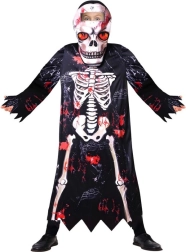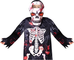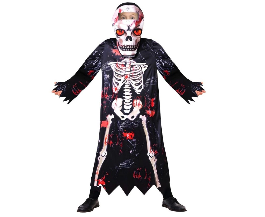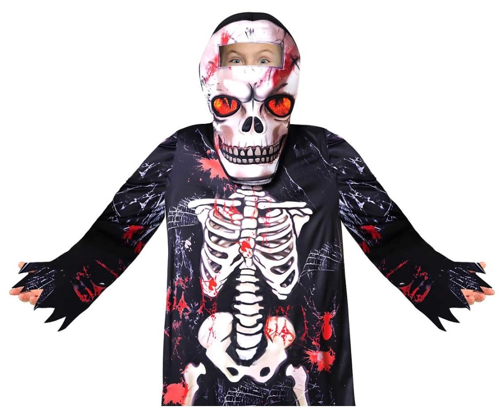 Grazie al materiale leggero, il costume è comodo da indossare e permette libertà di movimento durante il gioco e il ballo. La stampa scheletrica ad alto contrasto con accenti rossi dona al bambino un look spaventoso ma anche divertente senza bisogno di trucco elaborato.