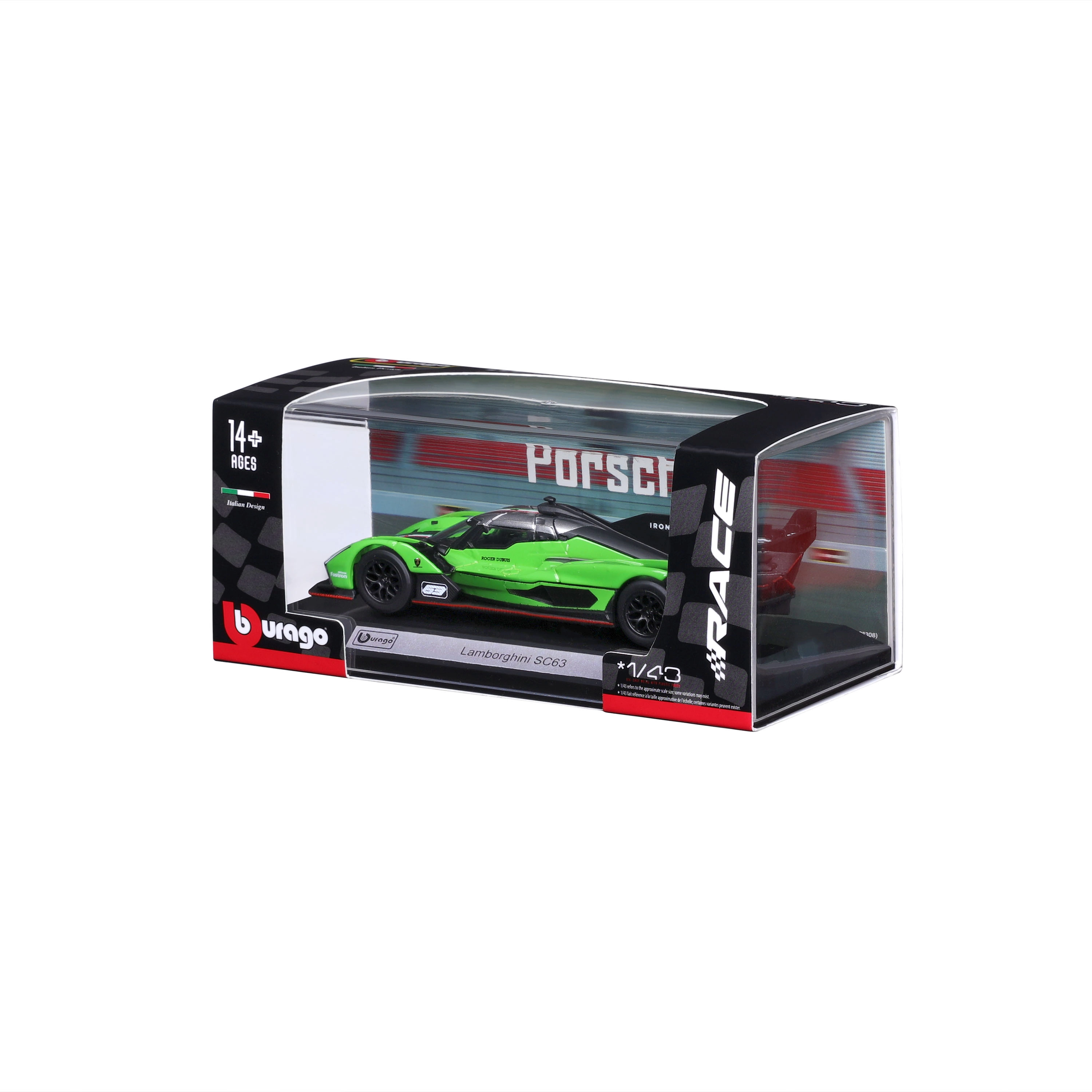 Goditi la lavorazione di alto livello del modello da collezione Bburago 1:43 Lamborghini SC63. Grazie alla carrozzeria in metallo (die-cast), alle linee precise e alle livree da corsa, il modello appare fedele e accattivante sia sulla mensola della collezione sia sulla scrivania.