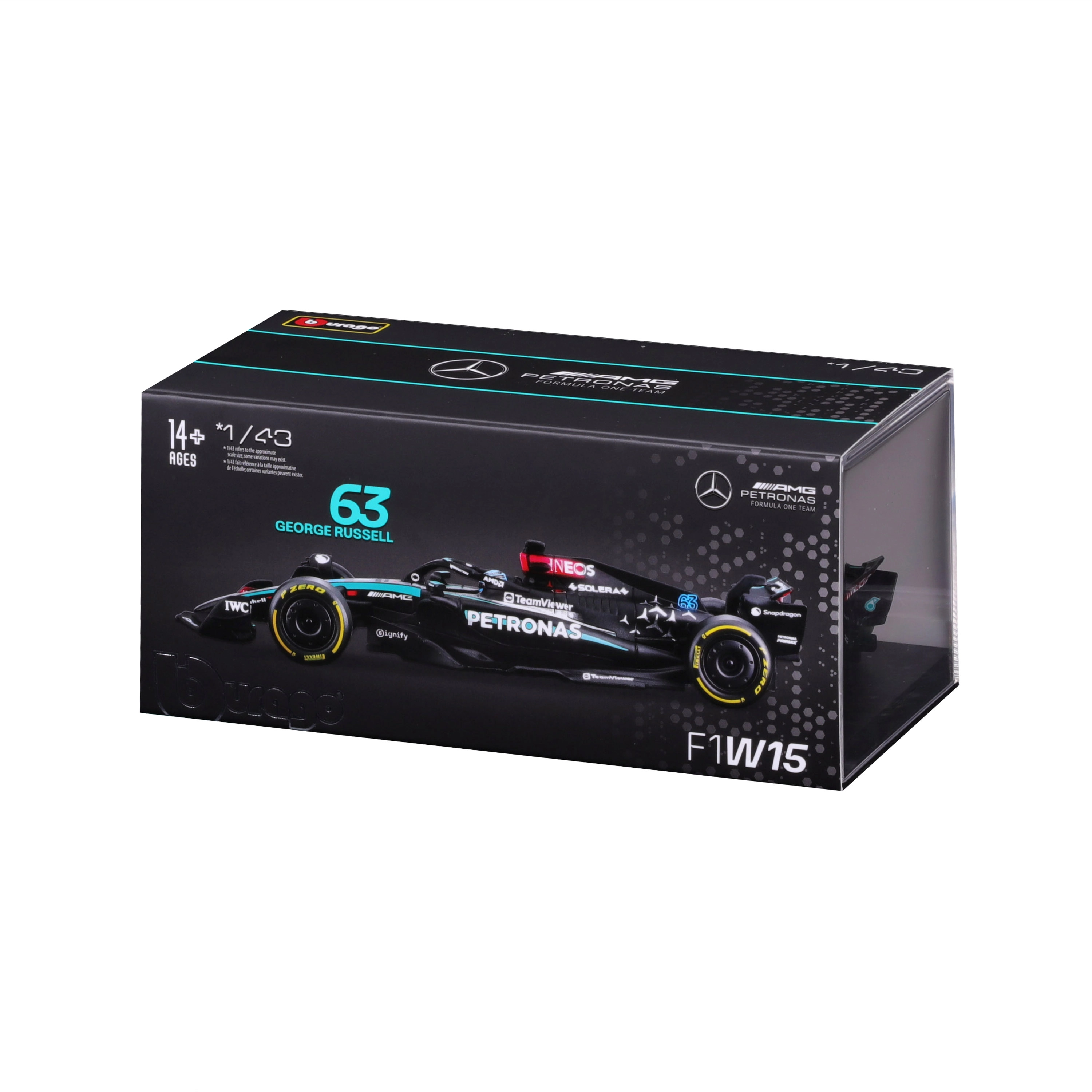 Modello da collezione dettagliato MERCEDES‑AMG PETRONAS F1 W15 in scala 1:43 di Bburago, con una riproduzione realistica della stagione 2024 e numero di gara 63 George Russell. Non mancano stampe precise, elementi aerodinamici, ruote liberamente rotanti e confezione da vetrina per un’esposizione sicura.