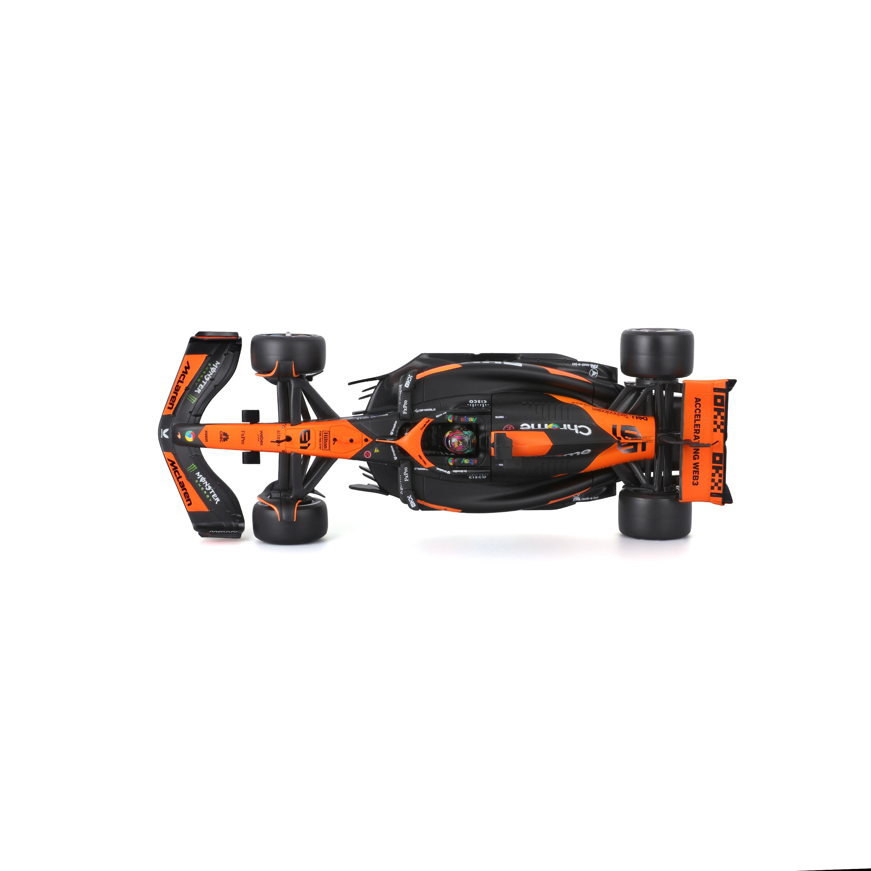 Ali, halo e pance modellati con precisione garantiscono l’aspetto autentico della McLaren MCL38 in scala 1:24.