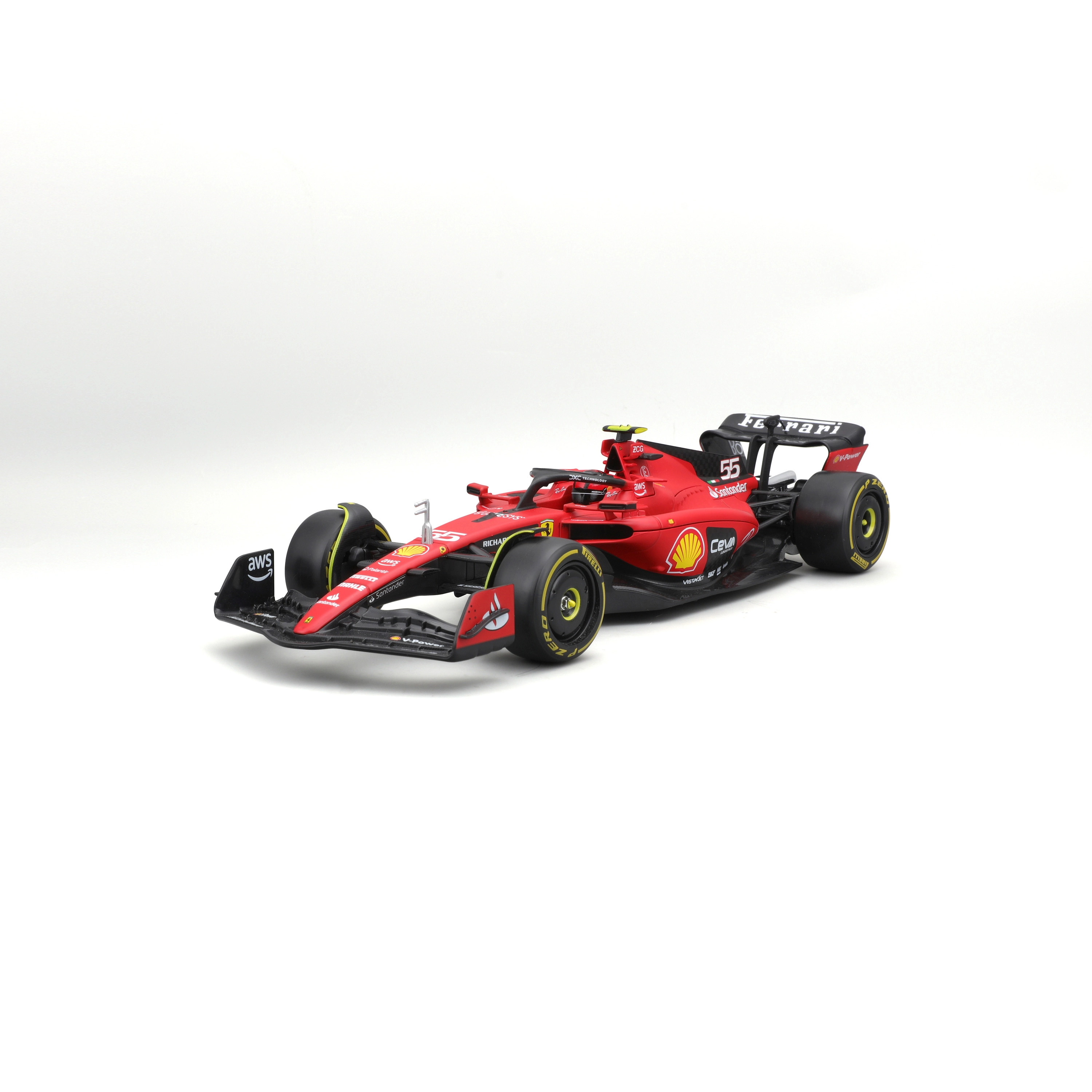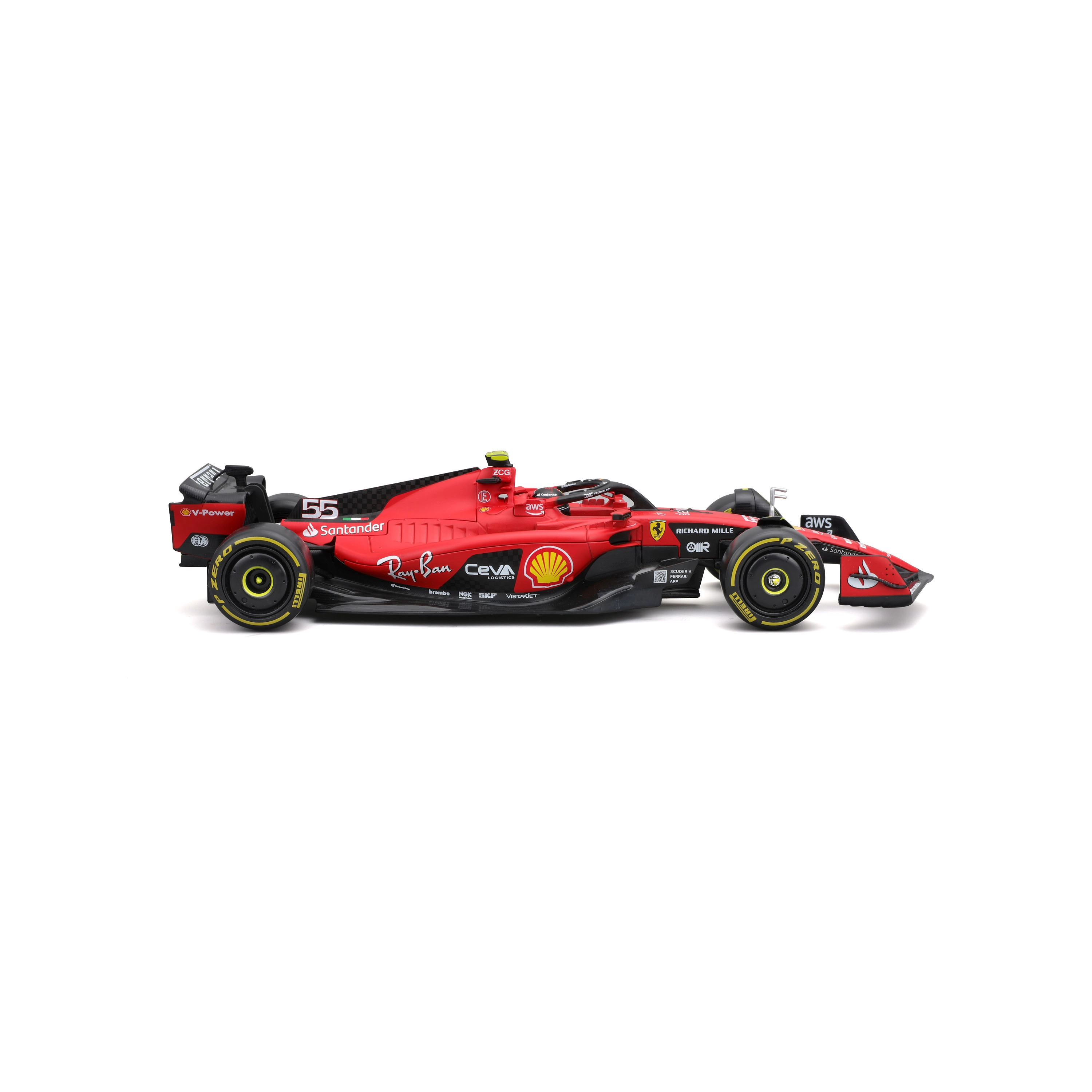 Elementi aerodinamici accurati, halo, alettoni e pneumatici slick realistici con stampe dettagliate riproducono fedelmente la vera monoposto FERRARI SF23.