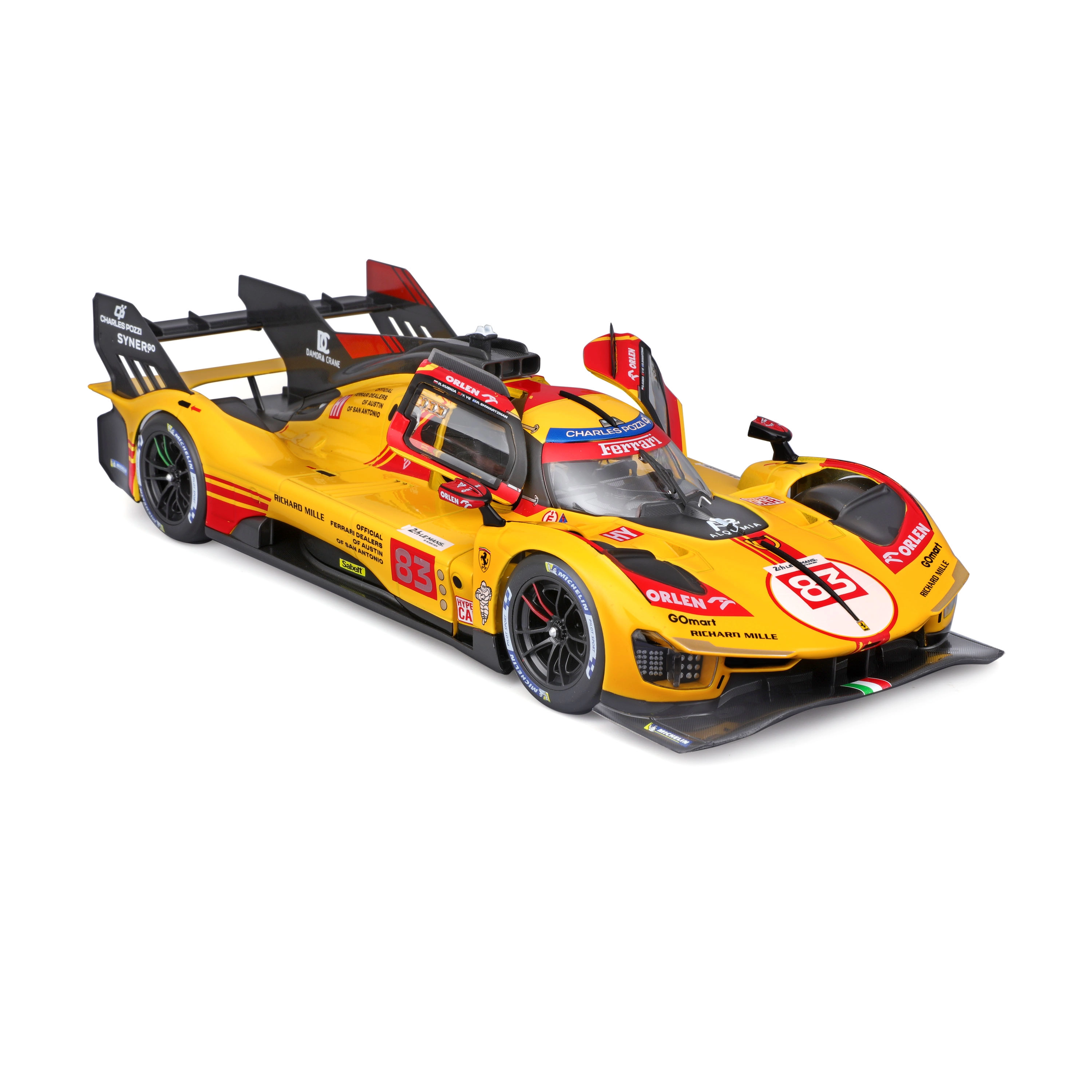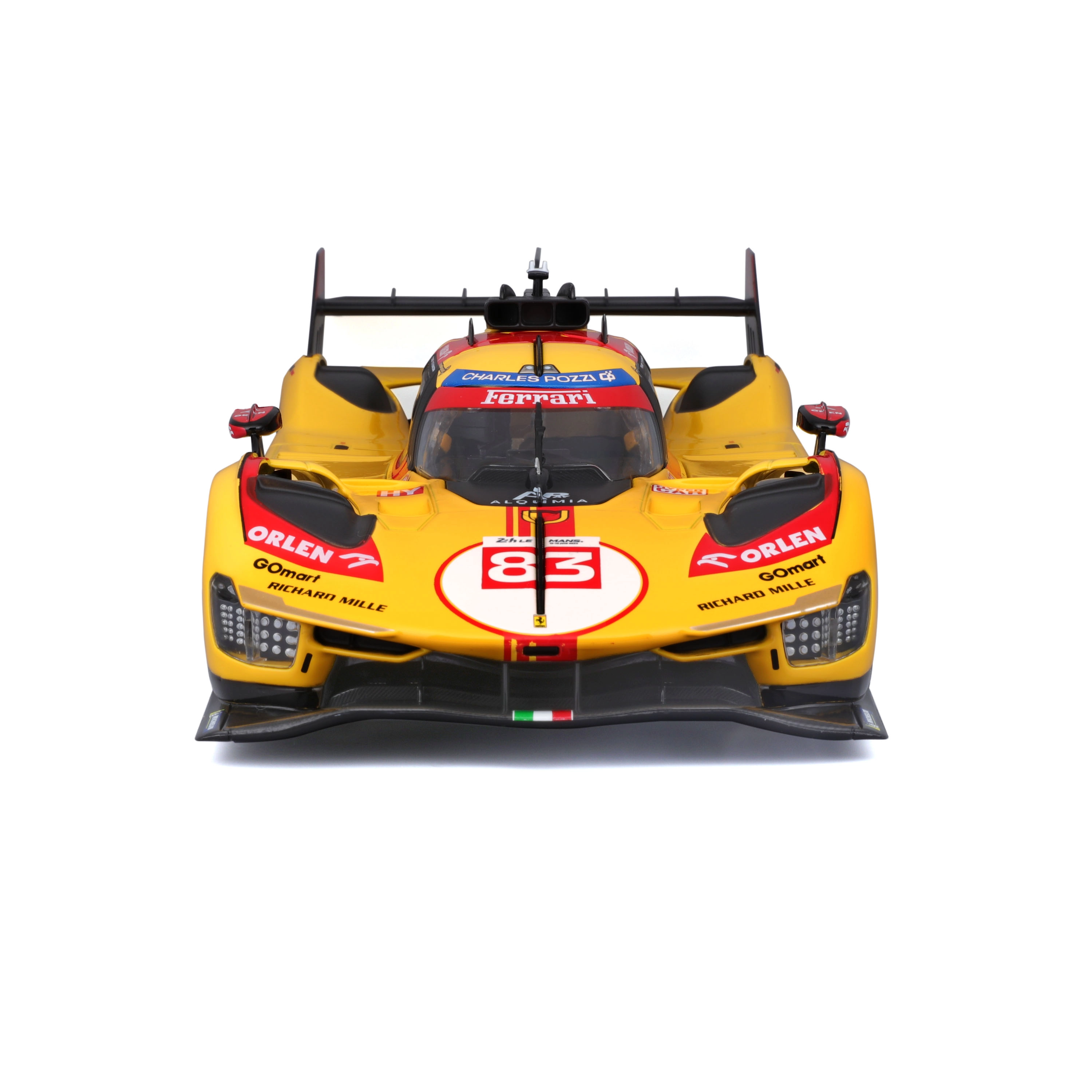 Scoprite il modello finemente realizzato della Ferrari 499P nella iconica livrea giallo‑rosso con il numero di gara 83 dalla celebre 24H Le Mans 2024. Struttura in metallo con finitura di superficie precisa, aerodinamica riprodotta fedelmente e dischi freno realistici sottolineano l’aspetto autentico del prototipo da competizione.