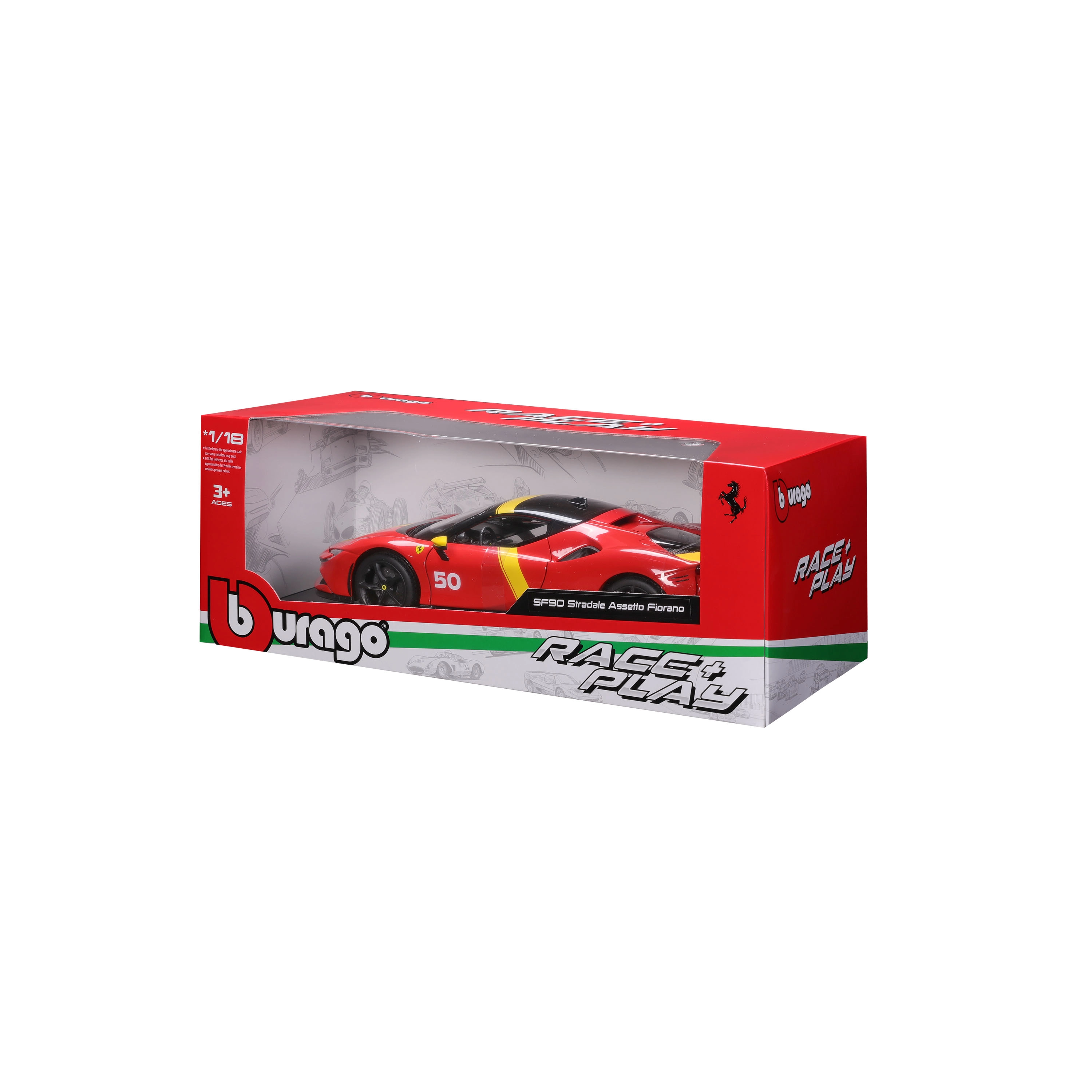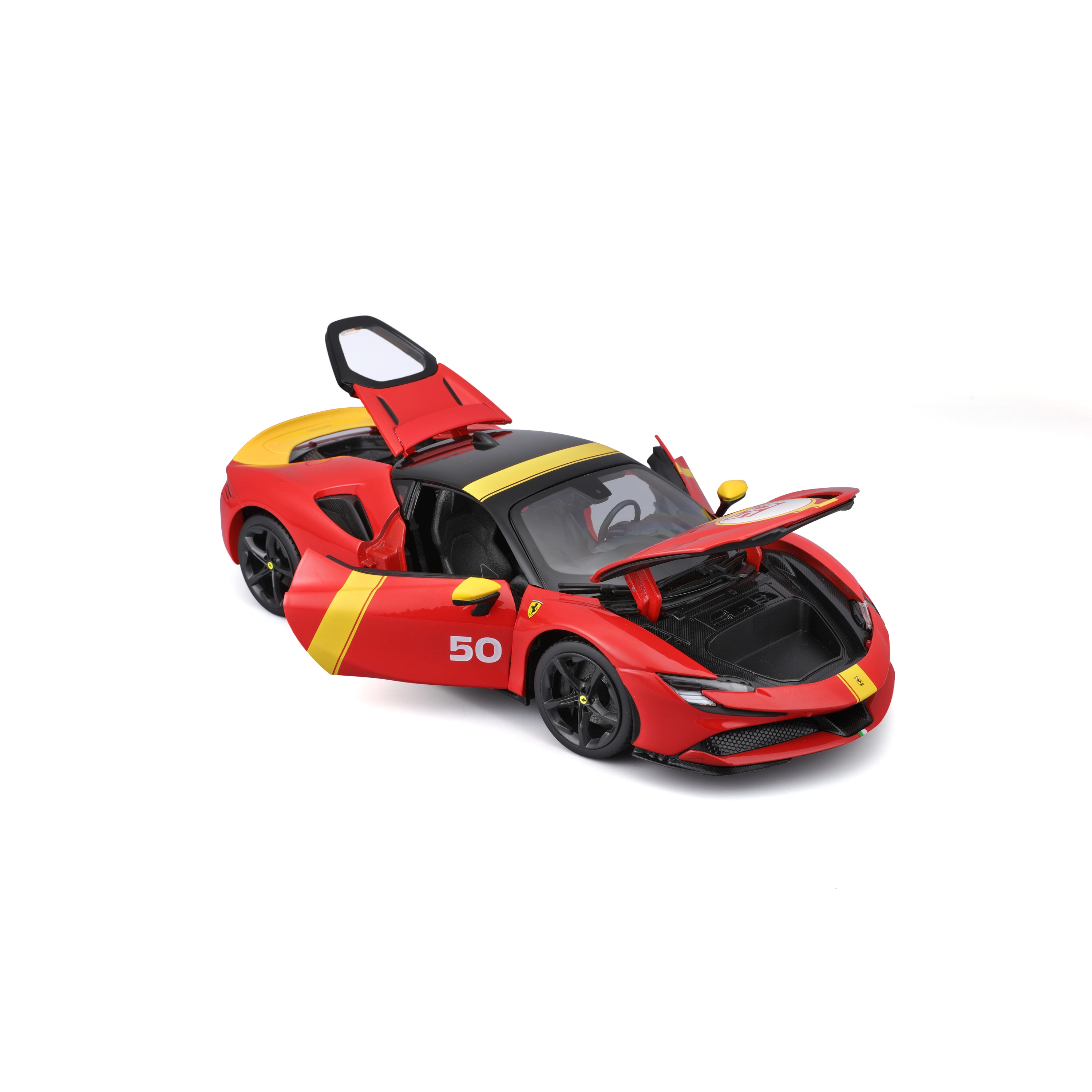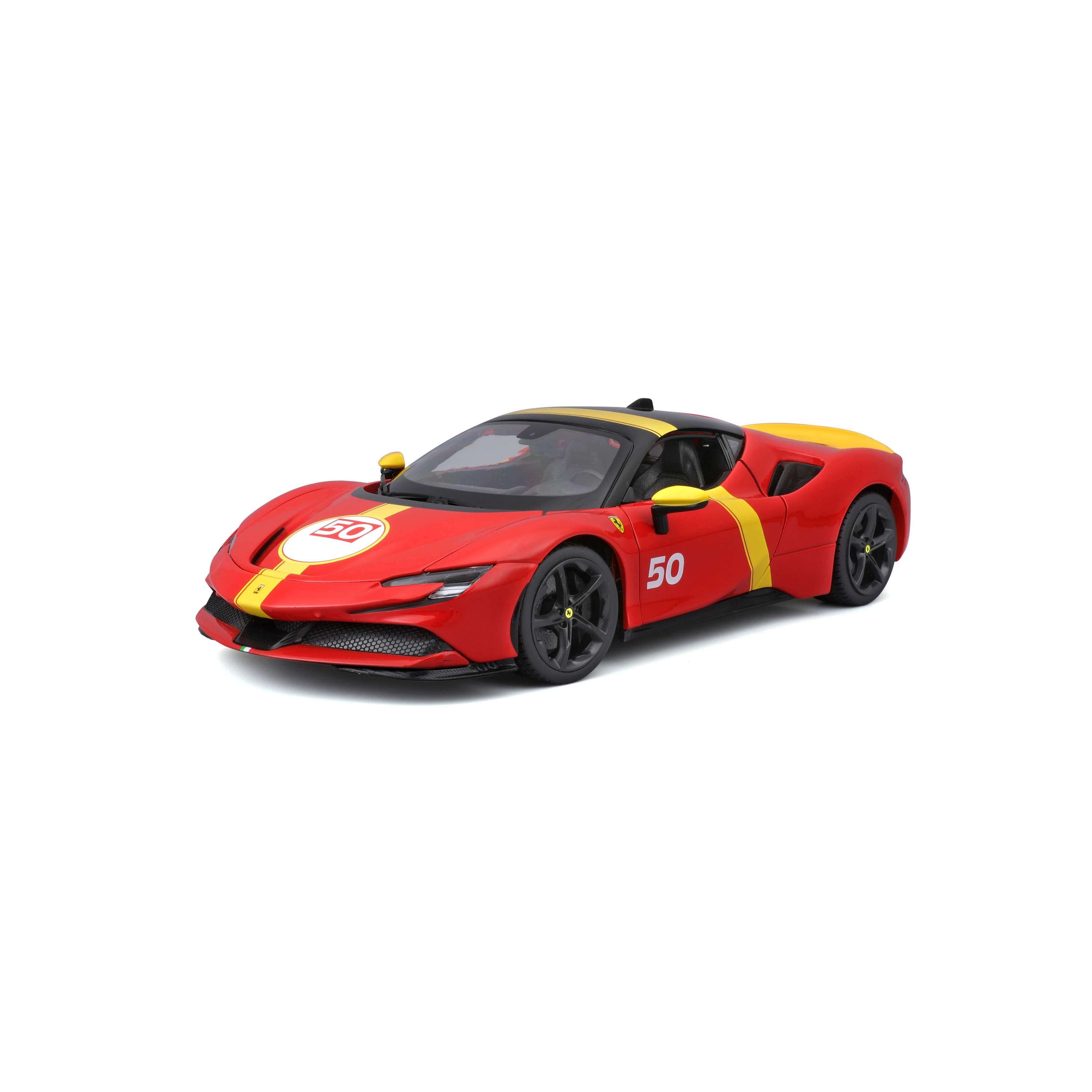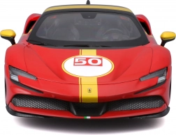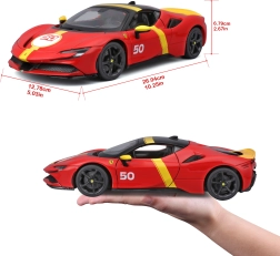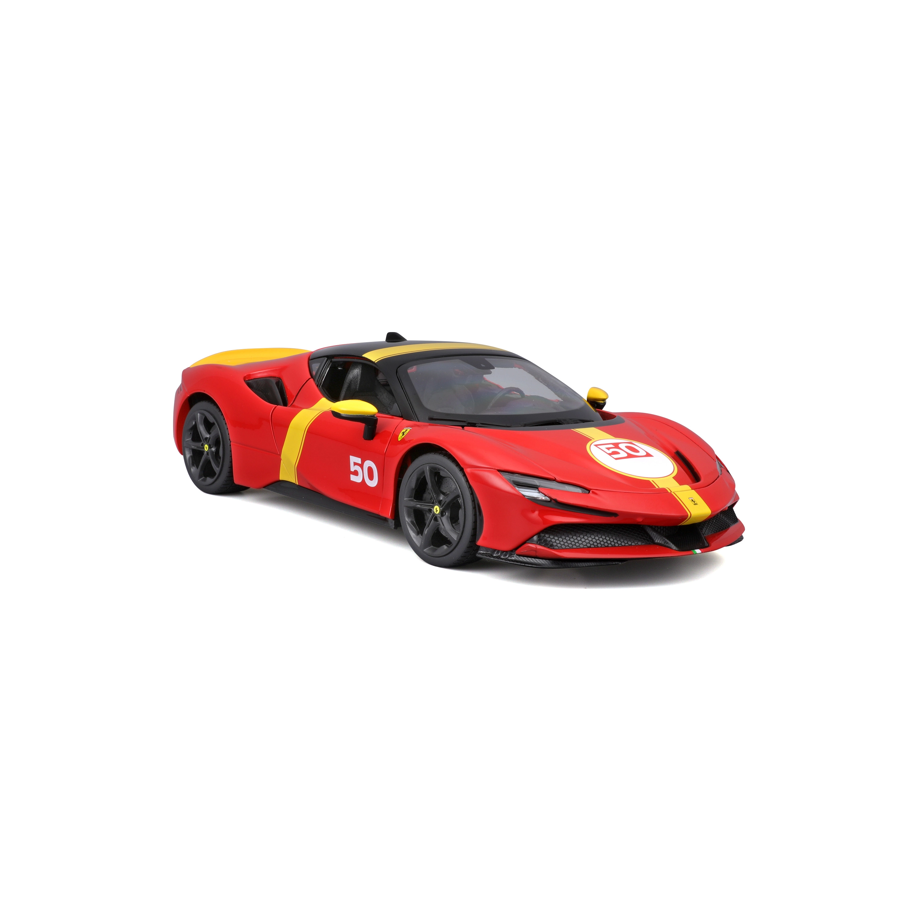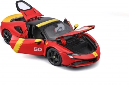 Questo modello da collezione di alta qualità in scala 1:18 riproduce fedelmente la Ferrari SF90 Stradale con il pacchetto sportivo Assetto Fiorano. La vernice rossa con strisce gialle e numero 50, i fari realistici, le ruote multipezzo e gli elementi aerodinamici sagomati con precisione rendono questo pezzo un'attrattiva dominante in ogni vetrina.