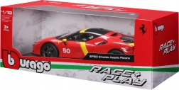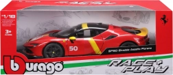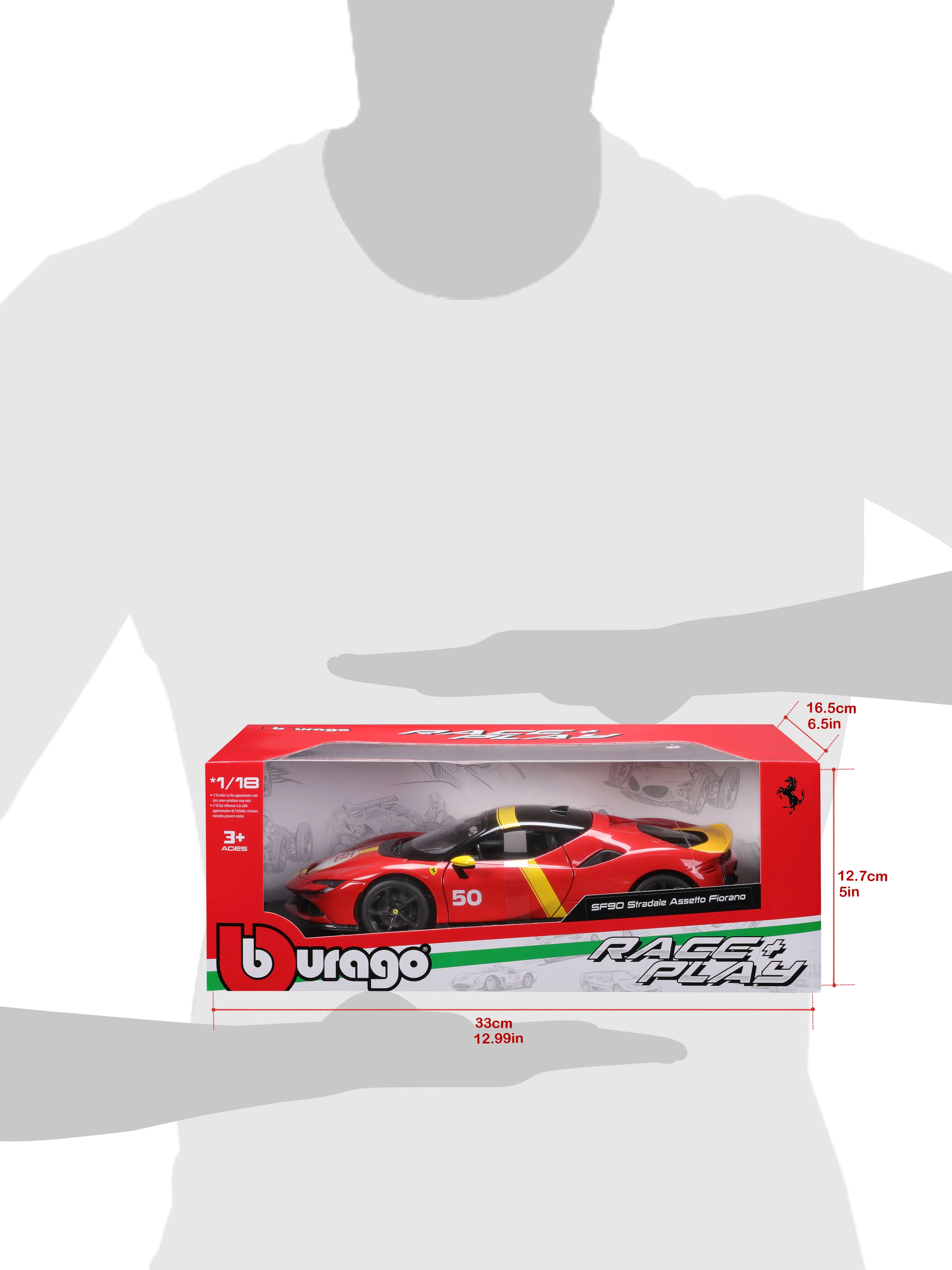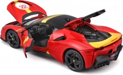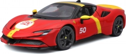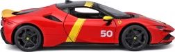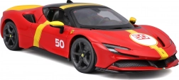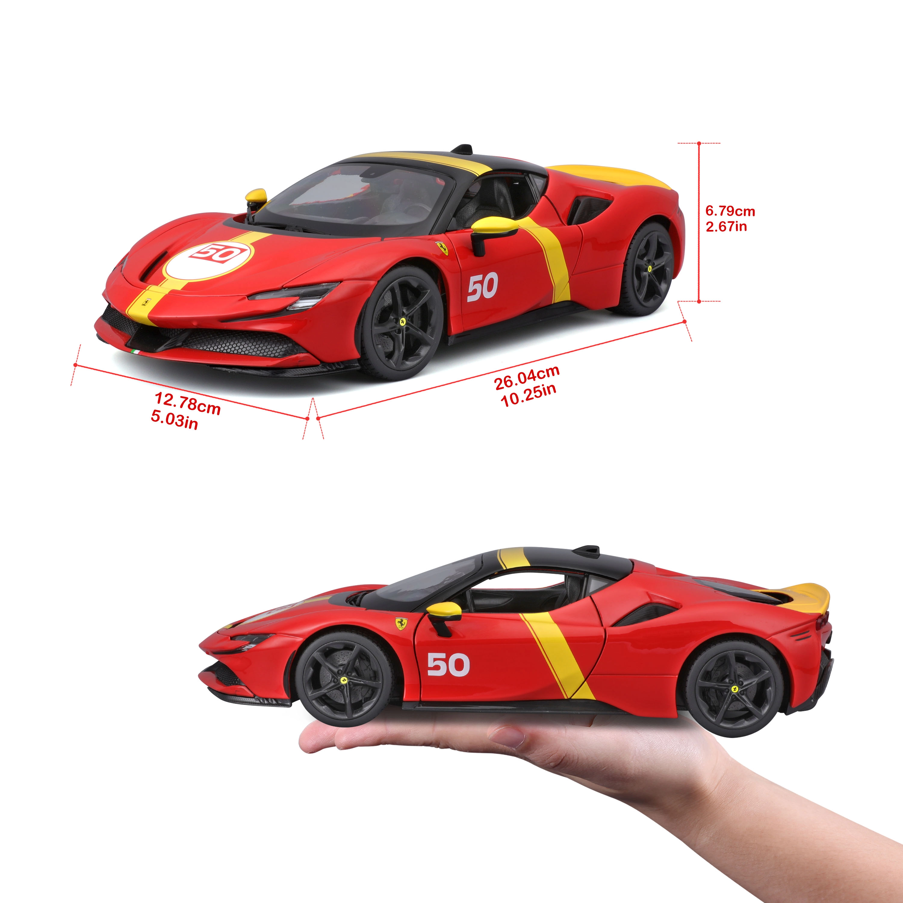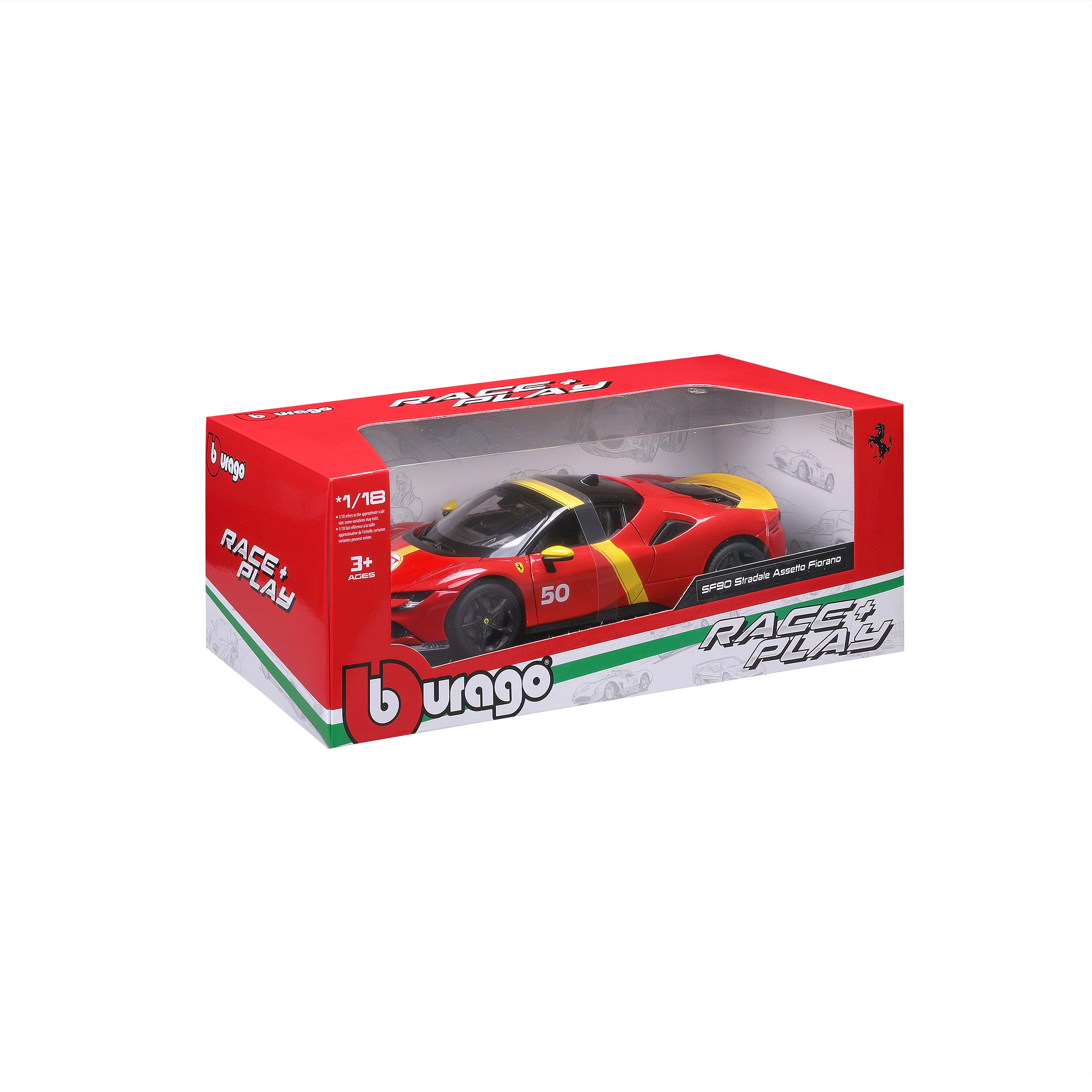 Questo modello da collezione di alta qualità in scala 1:18 riproduce fedelmente la Ferrari SF90 Stradale con il pacchetto sportivo Assetto Fiorano. La vernice rossa con strisce gialle e numero 50, i fari realistici, le ruote multipezzo e gli elementi aerodinamici sagomati con precisione rendono questo pezzo un'attrattiva dominante in ogni vetrina.