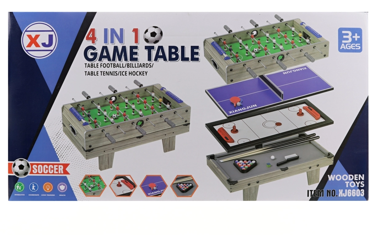 Questo set multifunzione include quattro amati giochi da tavolo in un unico formato compatto. La grande base in legno garantisce stabilità e lunga durata, mentre le tavole intercambiabili consentono un passaggio rapido tra calcio da tavolo, hockey, ping pong e biliardino. Una soluzione perfetta per il divertimento in casa senza dover acquistare più giochi separati.