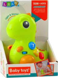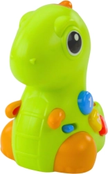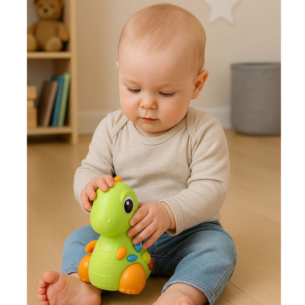 Il dinosauro interattivo cattura l’attenzione dei bambini a prima vista: premendo i pulsanti colorati si illumina, riproduce melodie ed emette suoni allegri. Un leggero tocco sul naso avvia musica e movimento, favorendo la comprensione del nesso tra tocco e reazione del giocattolo: una base perfetta per imparare giocando.