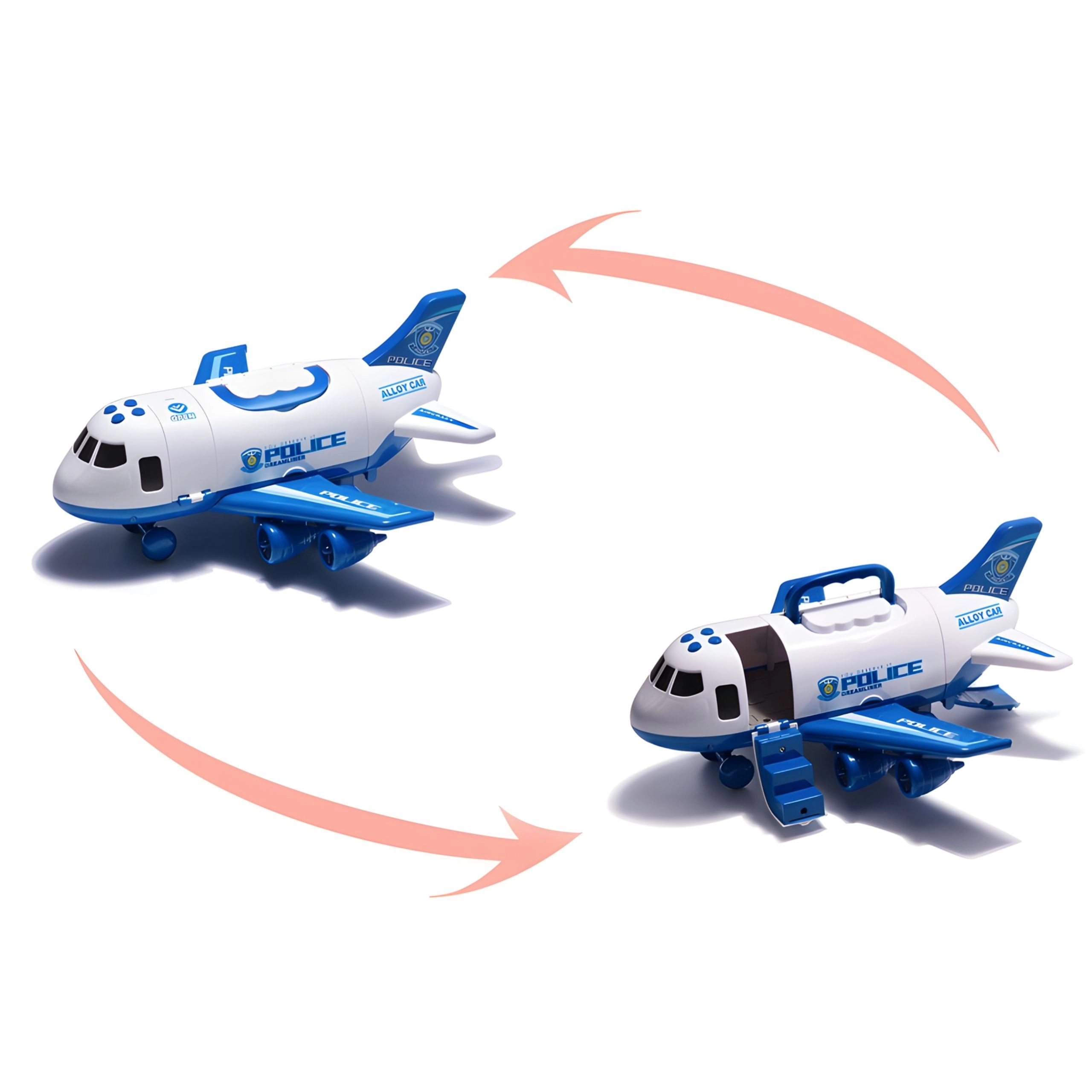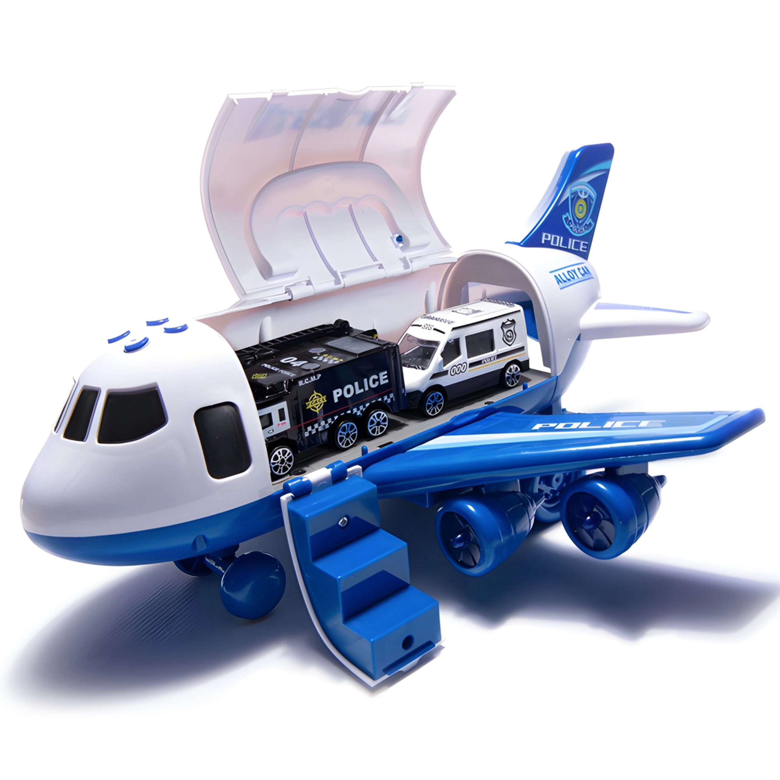 All’interno dell’aereo puoi trasportare 3 auto della polizia e posizionare 7 segnali stradali per scenari d’azione e per insegnare le regole del traffico.