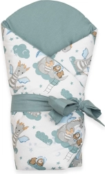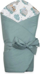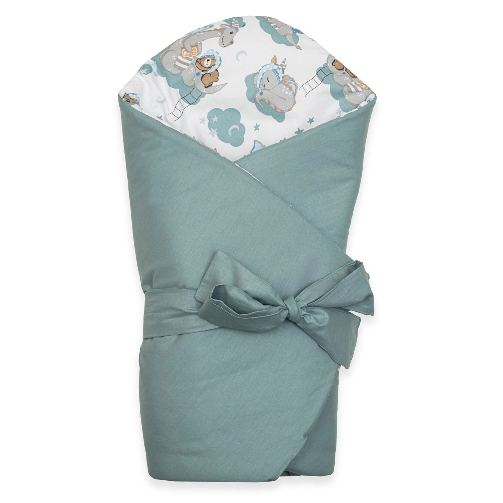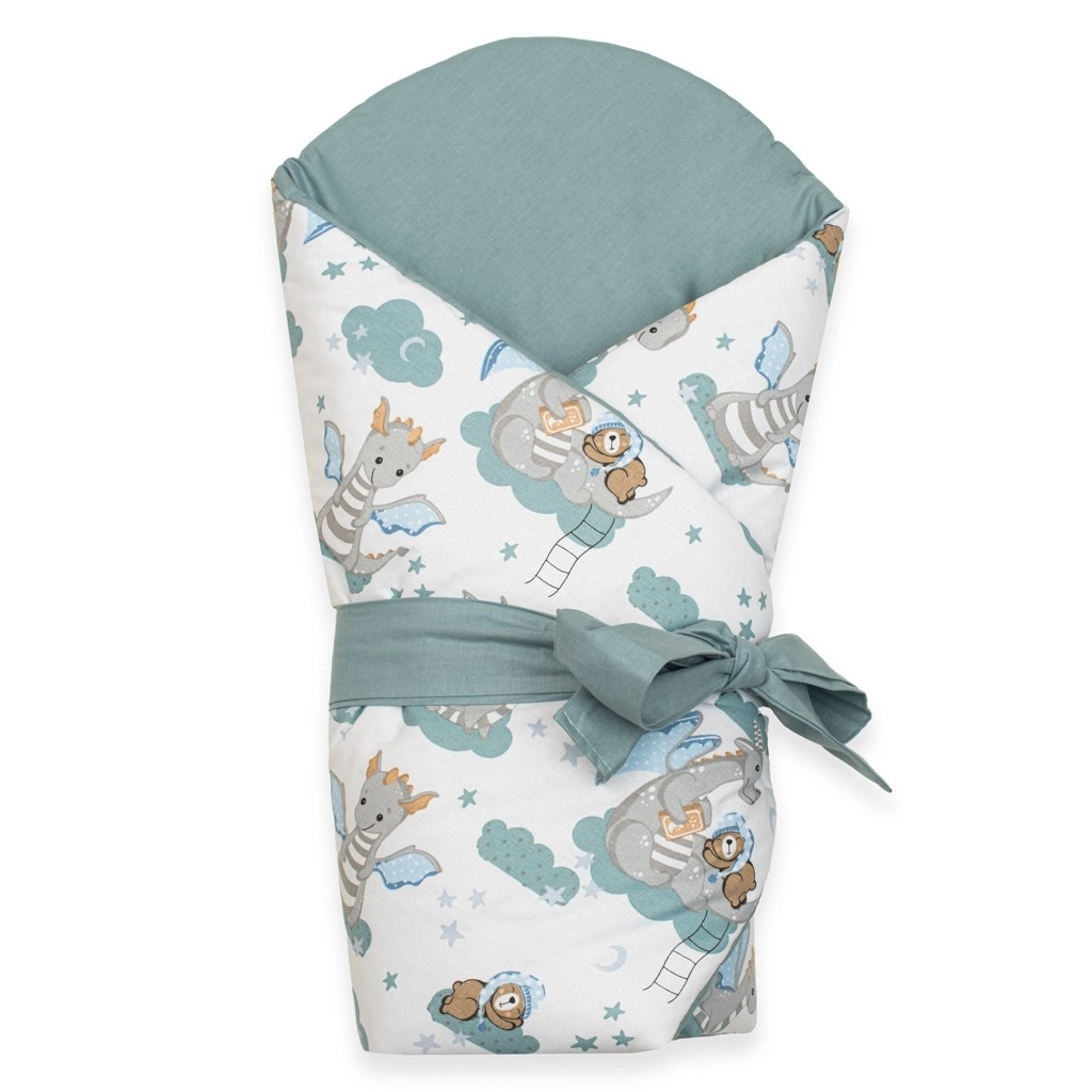 Morbida fascia per neonati double face New Baby Draghetto, misura 80 × 80 cm, garantisce al bebè calore, comfort e fasciatura sicura. Presenta un imbottitura più spessa di circa 3 cm per i giorni più freddi, una piacevole superficie in cotone e una chiusura con velcro completata da un nastro da annodare. I materiali sono anti‑allergici e certificati OEKO‑TEX Standard 100.