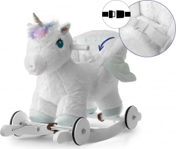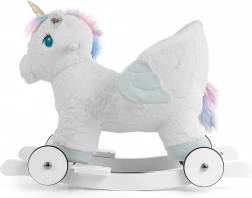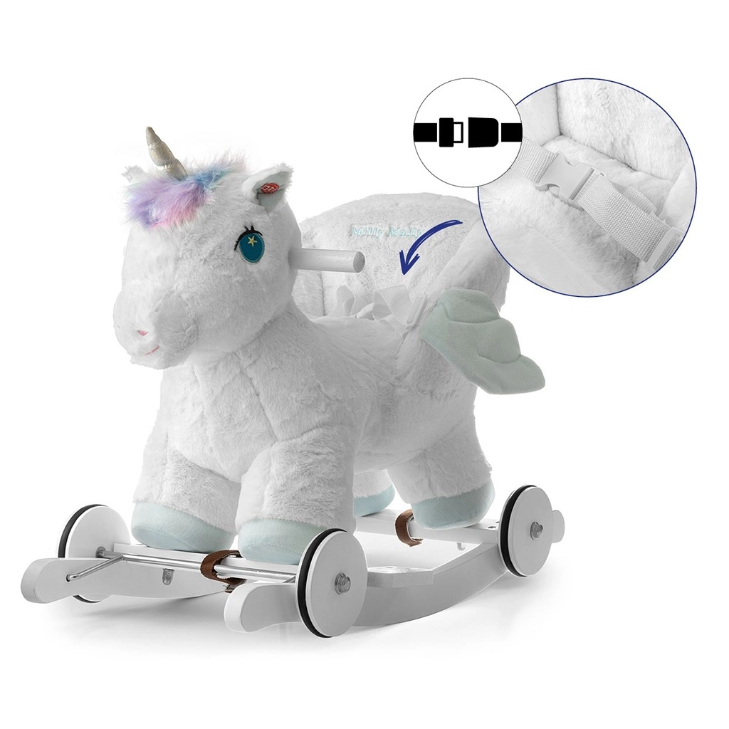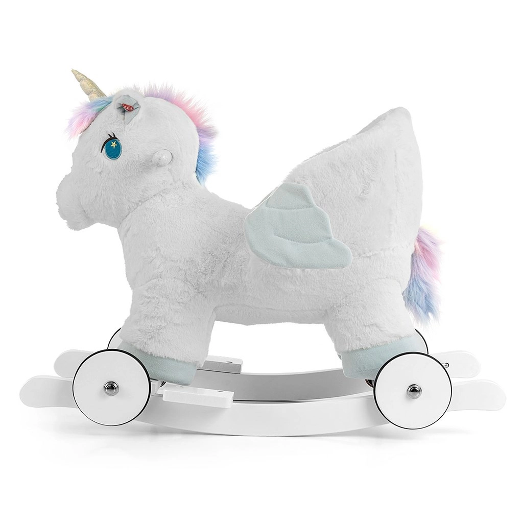 In pochi secondi puoi passare dalla modalità dondolo alla guida: le ruote ribaltabili trasformano l’unicorno in un dolce veicolo cavalcabile per uso interno. Le orecchie interattive, se premute, riproducono i suoni del galoppo e un gioioso nitrito, stimolando i sensi. Giocare con l’unicorno a dondolo aiuta a sviluppare la coordinazione motoria, la fantasia e il senso dell’equilibrio.