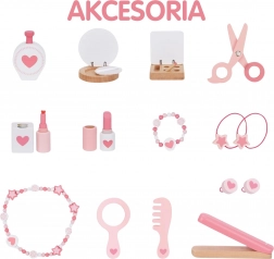 Il set comprende ricchi accessori in legno per un gioco realistico: pettine, forbicine, phon, specchietto, cipria con specchietto, ombretti, rossetto, smalto per unghie, anche “profumi” e gioielli (collana, braccialetti, anellini), oltre a elastici e decorazioni per capelli. Il gioco sviluppa naturalmente motricità fine, creatività, coordinazione e autostima.