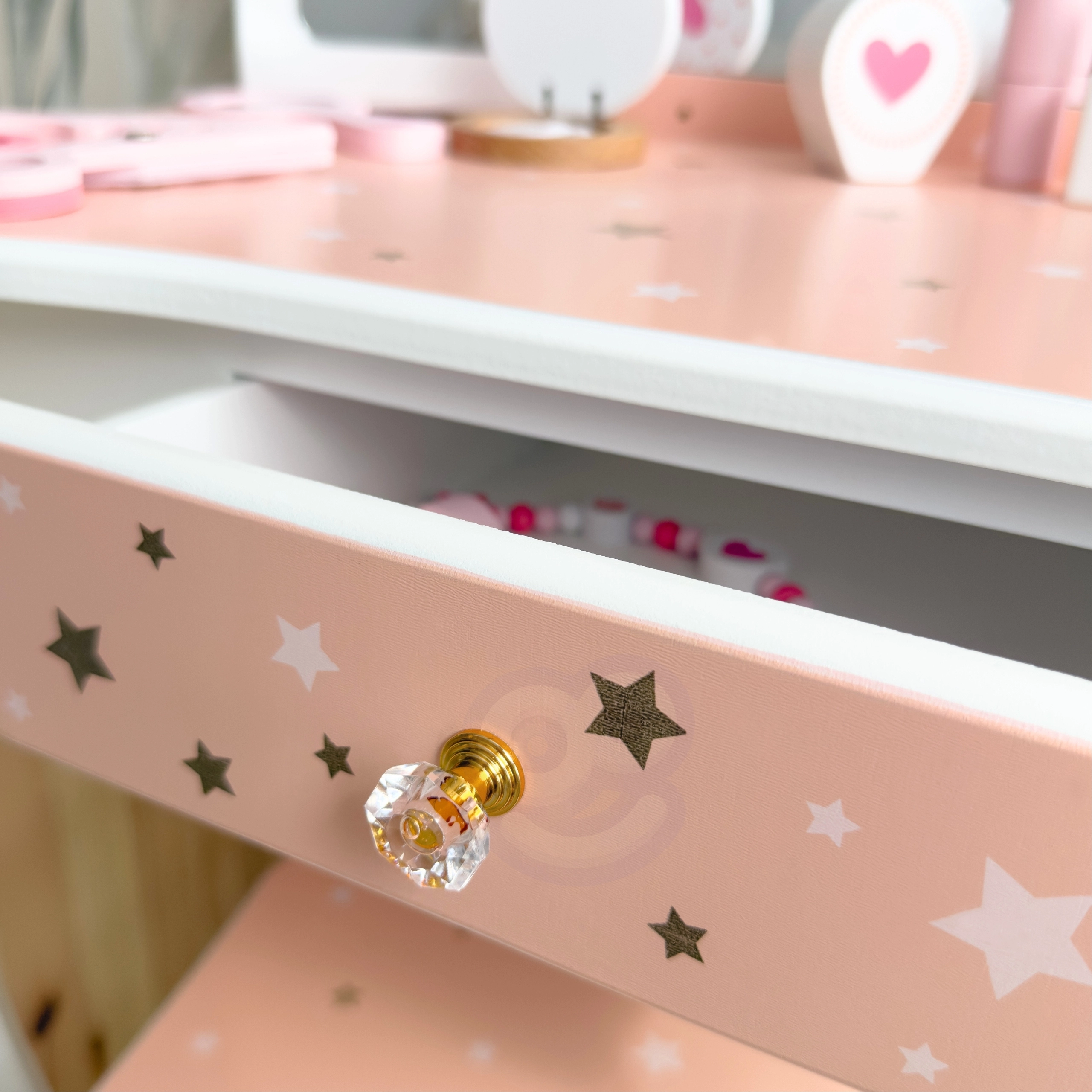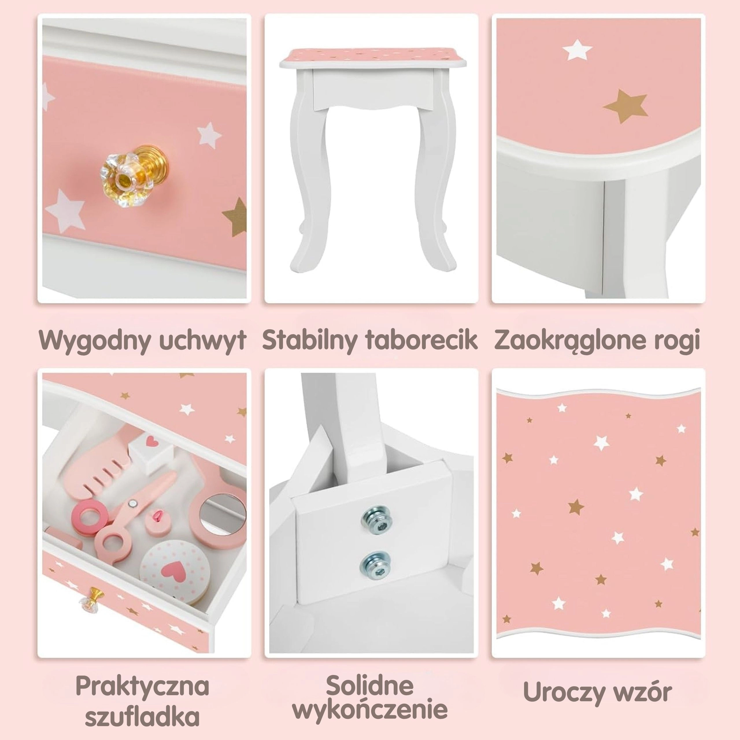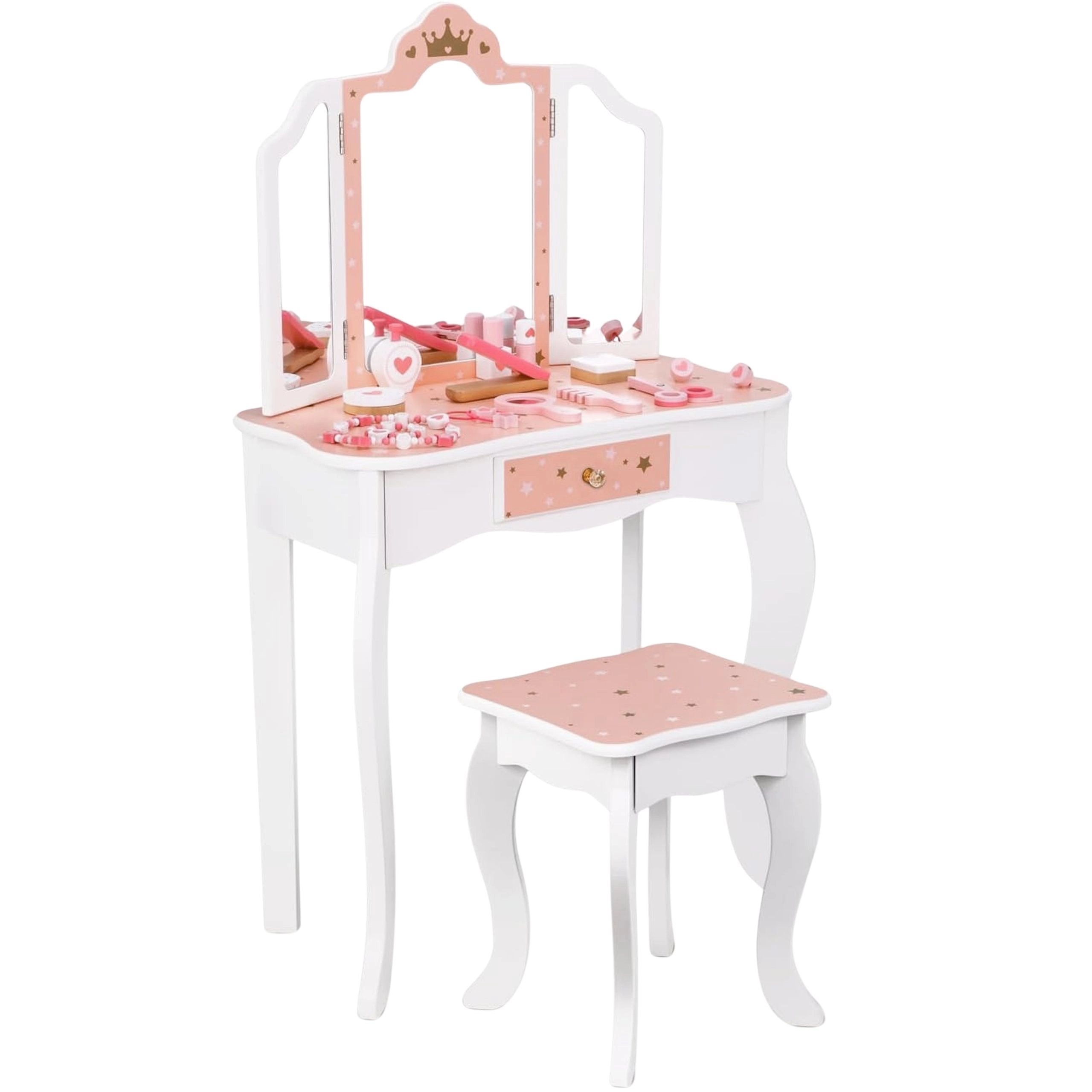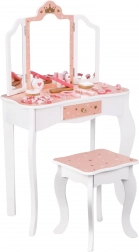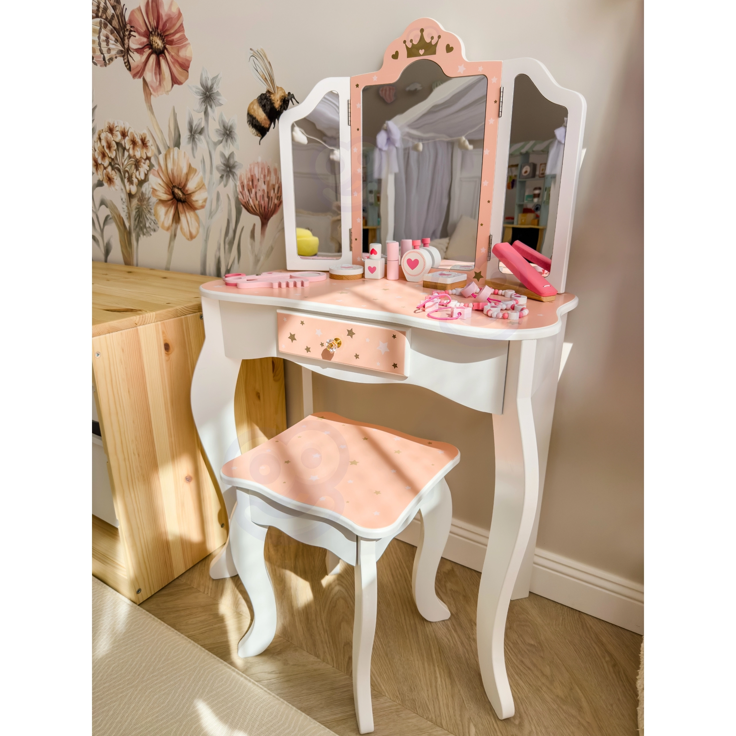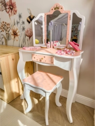Regalate ai bambini il loro angolo beauty magico. La toeletta in legno WOOPIE GREEN, nelle delicate tonalità pastello di rosa e bianco, conquista con il design elegante, lo specchio tripartito con alette mobili, il piano spazioso e il pratico cassetto per i piccoli tesori. Inclusa una comoda sgabello adatto all’altezza dei bambini.