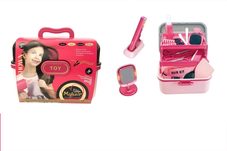Trasformate la cameretta in un piccolo salone di parrucchiere. Questo set giocoso include una piastra per capelli rosa per bambini con pratico supporto e un solido specchio da tavolo con lucine che creano l’atmosfera di un salone professionale. Tutti gli accessori sono realizzati in plastica leggera e adattati alle mani dei bambini.