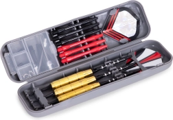 Set completo di freccette per divertimento in casa e allenamento. Include 3 freccette in ottone pronte all’uso da 17 g, punte di ricambio, shaft e alette e una pratica custodia. Grip zigrinati (knurled) per una presa sicura e traiettoria di volo precisa su bersagli classici in sisal.