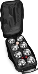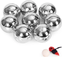 Il set include 8 bocce in acciaio cromato con diversi motivi lineari per distinguere facilmente i giocatori. Ogni boccia ha un diametro di 72 mm e un peso di circa 700 g per una presa sicura e un lancio stabile. Sono inclusi il jack in legno e il cordino di misurazione per determinare con precisione quale boccia è più vicina – gioco corretto senza discussioni.