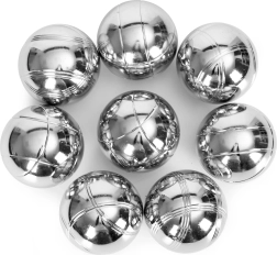 Bocce in acciaio lucido con linee incise che garantiscono una presa sicura e un rapido riconoscimento durante il gioco. La struttura resistente è pronta per l’uso all’aperto.