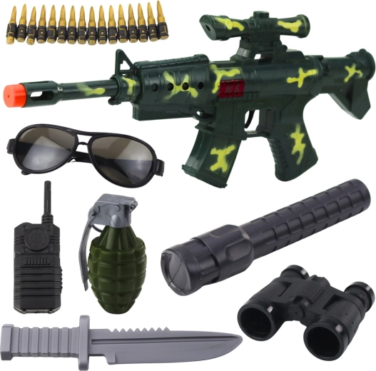Il set include granata, coltello, binocolo, torcia, ricetrasmittente, occhiali e cintura con proiettili – tutto per scenari realistici e per sviluppare l’immaginazione.