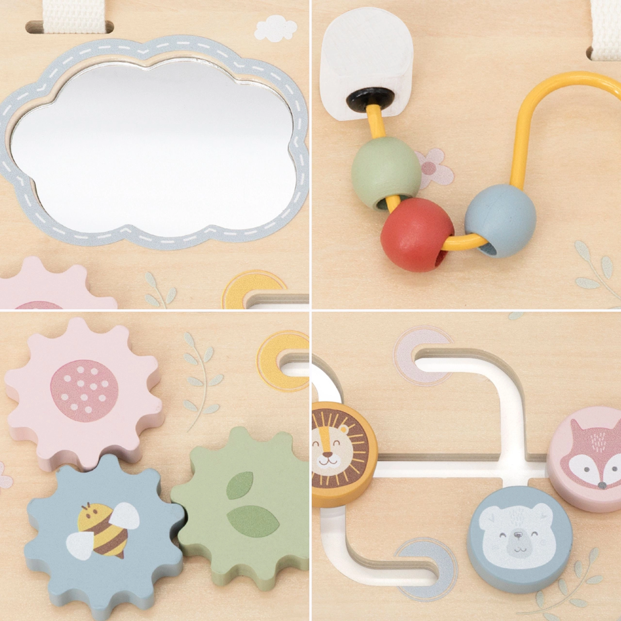 - Più attività in una – specchietto, labirinto, ingranaggi e cursore mantengono viva l’attenzione del bambino.