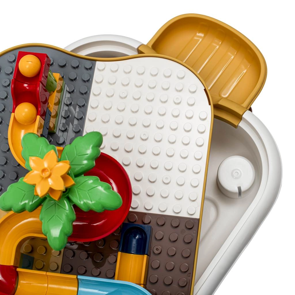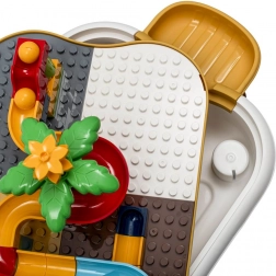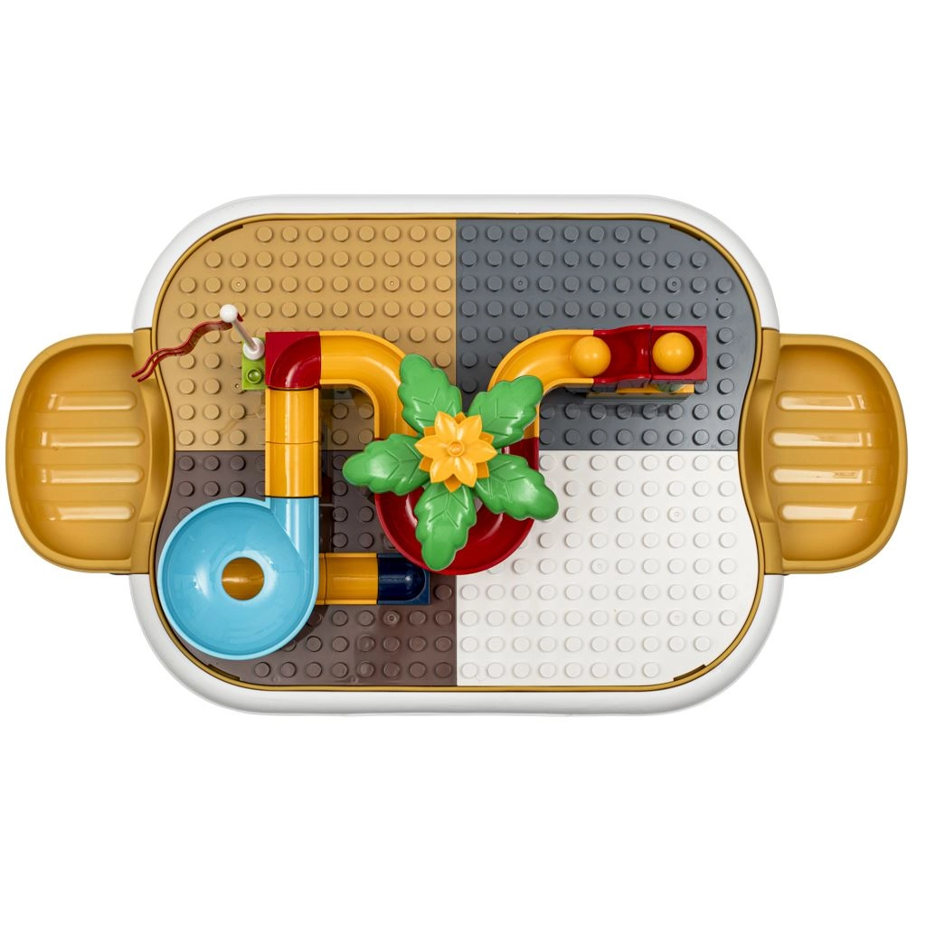 Questo tavolo da gioco compatto sviluppa fantasia, logica e motricità fine dei bambini. Sulla solida base con piastra a bottoncini (con stud) si possono costruire piste per biglie, torri e interi mondi. Inclusi tubi curvi, rampe ed elementi rotanti che guidano le biglie in modo divertente.