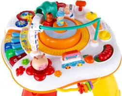 Il tavolino offre una dotazione ricca: pianoforte colorato con 3 modalità, trenino con orsetto a diverse velocità, ingranaggi, volante con automobilina, bruco scorrevole con frasi parlate, pulsante del segnale del treno, clacson e vivaci perline e anelli. Le gambe si smontano facilmente per giocare in modo compatto sul pavimento.