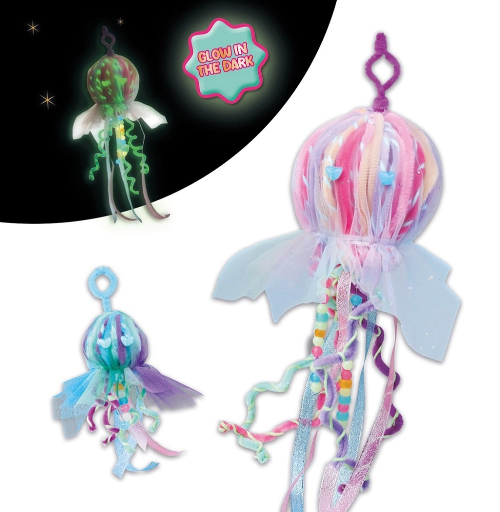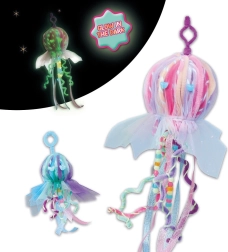Crea il tuo ciondolo a forma di medusa che si illumina al buio e dona luce a zaino, chiavi e cameretta. Questo set creativo completo contiene tutto il necessario – dai fil di ciniglia e filati luminosi alle nastri scintillanti, tulle leggero e perline fosforescenti. Un’ottima scelta per i bambini che amano i colori, le lucine e il mondo marino.