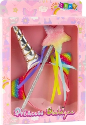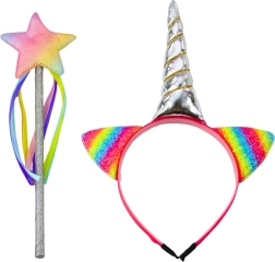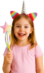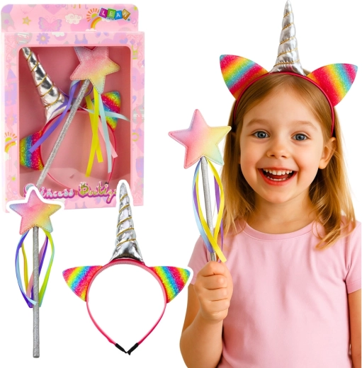 Questo incantevole set di accessori per piccole principesse, fatine e amanti degli unicorni offre tutto il necessario per travestimenti creativi e role-play. Il cerchietto con corno argentato metallico e orecchiette arcobaleno scintillanti, abbinato alla bacchetta con stella e nastri colorati, trasforma ogni gioco in uno spettacolo da fiaba.