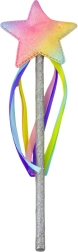 Una bacchetta leggera con impugnatura scintillante, stella in gradiente arcobaleno e nastri colorati per effetti incantevoli durante il gioco.