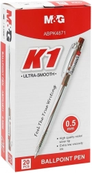 Affidabile penna a sfera M&G K1 con ricarica rossa e punta fine da 0,5 mm per una scrittura precisa e scorrevole senza interruzioni. Il corpo ergonomico garantisce una presa confortevole anche durante un uso prolungato – ideale per la scuola, l’ufficio e il lavoro domestico con i documenti.