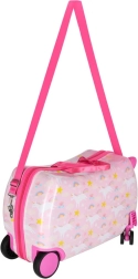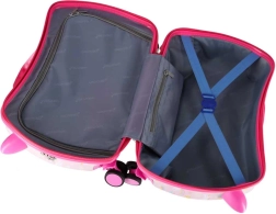 La struttura della valigia permette al bambino di sedersi comodamente e di farsi trainare con la cinghia. I lati stabili e i poggiapiedi aumentano comfort e sicurezza.