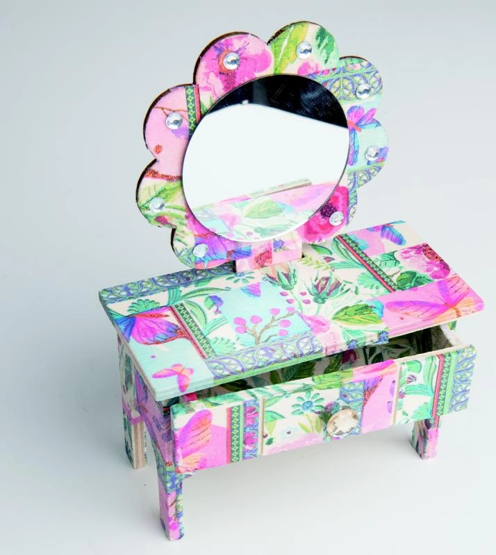 Il procedimento è semplice: prima assembli i pezzi in legno nella forma di una piccola cassettiera, poi trasferisci i motivi dei tovaglioli con la colla e infine rifinisci con gli strass. Un’ottima scelta per il relax creativo, lo sviluppo della motricità fine e un originale decoro per la casa.