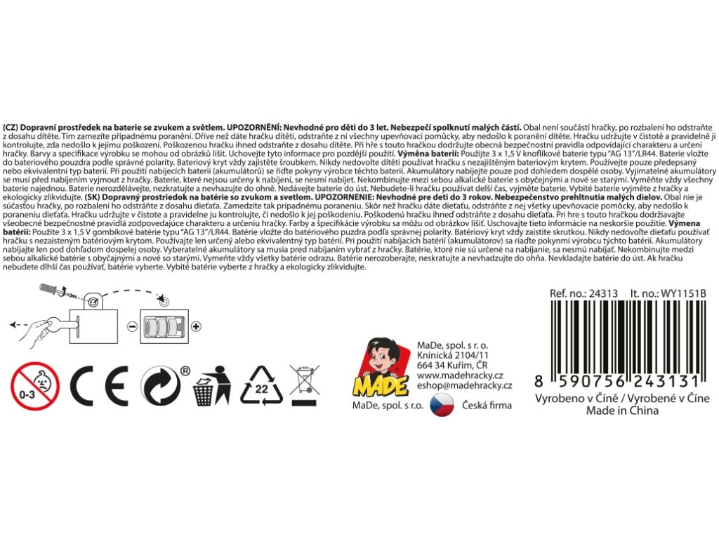Il giocattolo è realizzato in plastica di qualità ed è adatto ai bambini dai 3 anni. Le batterie tipo AG13 sono già incluse nella confezione, quindi l’auto è pronta all’uso immediatamente. Ideale per sviluppare immaginazione, motricità fine e gioco tematico.
