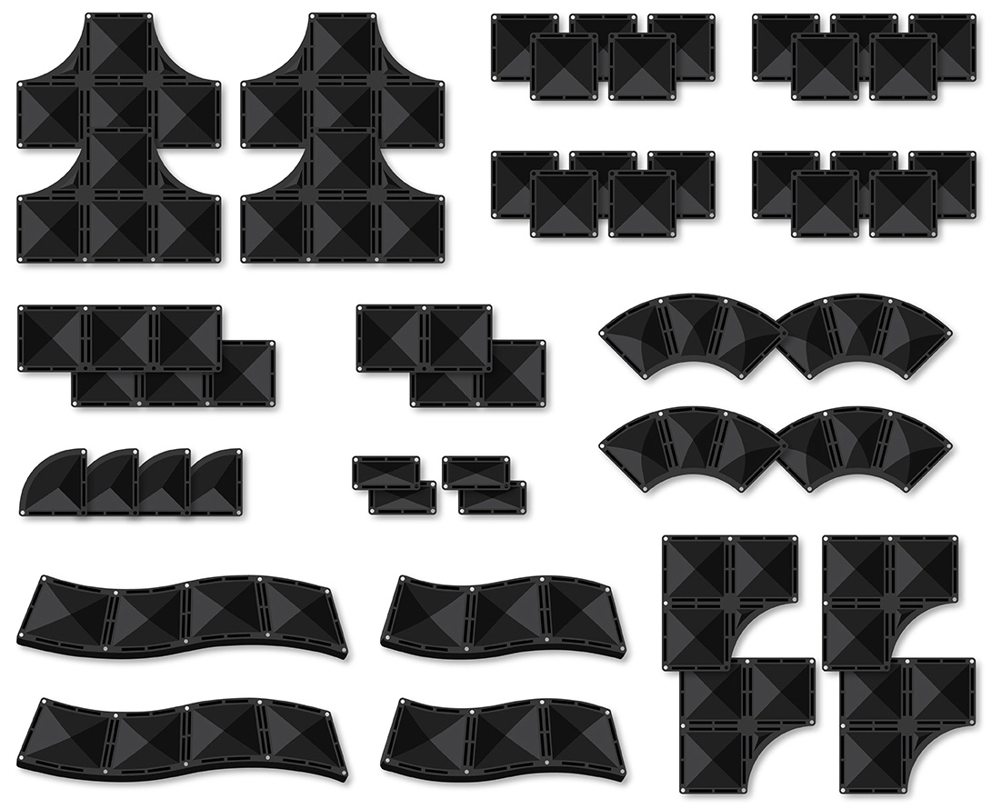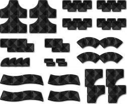 - 4× rampa, 4× inversione, 4× pezzo a T, 4× incrocio R, pezzi rettangolari e quadrati, 4× quarto di cerchio, 4× piccoli rettangoli, libretto illustrato d’ispirazione