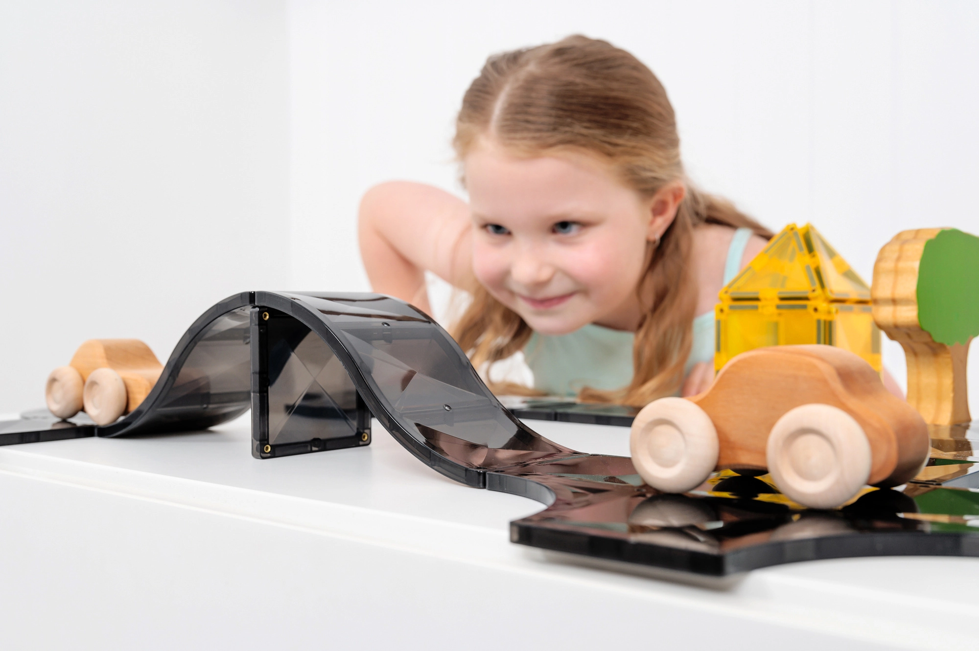 Combina rampe, curve, pezzi a T e incroci in layout a piacere. Il collegamento magnetico è rapido, stabile e divertente grazie al soddisfacente “click”.