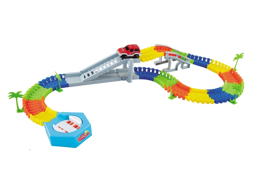 La confezione include una automobilina a batteria, che sfreccia sulla pista in modo fluido grazie alla larghezza del binario di 7,8 cm. L’alimentazione è garantita da 2× 1,5 V AA (batterie stilo, non incluse). La pista può essere riconfigurata e ampliata in qualsiasi momento, così il divertimento non finisce mai.