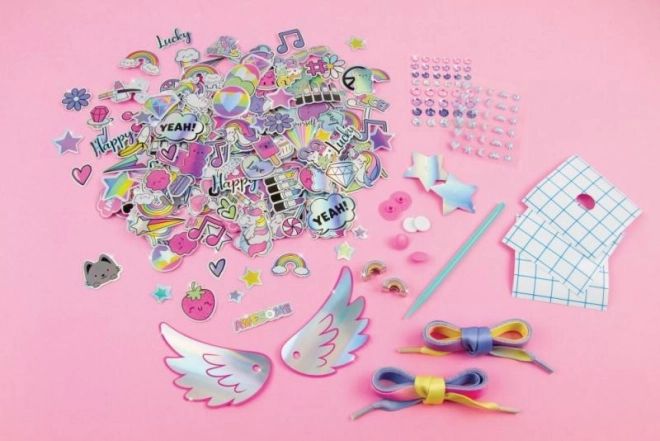 - Adesivi decorativi, ciondoli con perline, lacci per scarpe