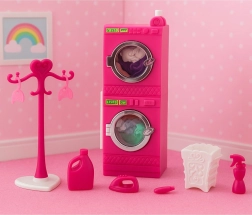 Regala ai bambini una mini lavanderia che riproduce fedelmente le attrezzature domestiche reali. Con il pulsante il cestello della lavatrice si mette in moto, l'asciugatrice completa la cura dei “vestitini” e l'appendiabiti da pavimento con grucce aiuta a organizzarli. Il design rosa e bianco conquista a prima vista e invita al gioco creativo.
