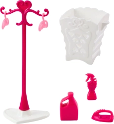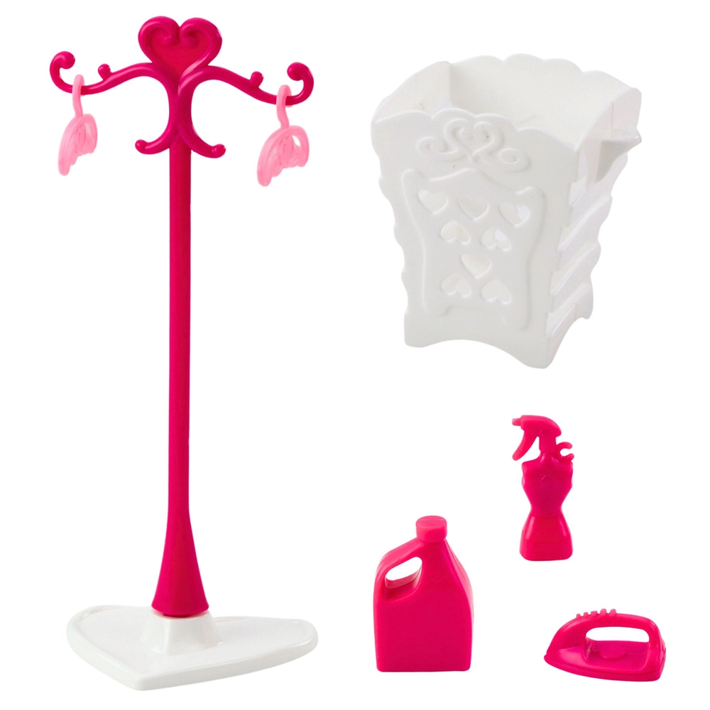 Include asciugatrice, cesta per il bucato, ferro da stiro, vaporizzatore, boccetta di “detersivo” e appendiabiti da pavimento con grucce per una zona di gioco perfettamente organizzata.