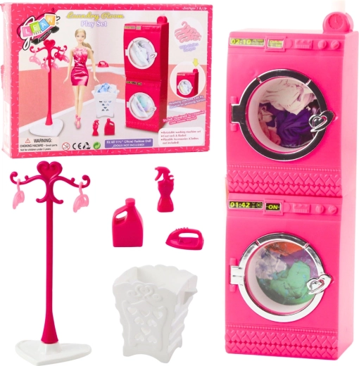Elegante lavanderia rosa per bambole alte circa 29 cm che offre un gioco domestico realistico. Include una lavatrice con cestello rotante, un'asciugatrice, un appendiabiti da pavimento con grucce, una cesta per il bucato e accessori come “detersivi” e un ferro da stiro. Stimola creatività, motricità fine e gioco di ruolo.