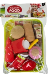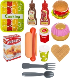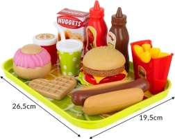 - vassoio, ketchup, salsa al cioccolato, panino per hot dog, würstel, posate (cucchiaio, coltello, forchetta), nuggets, marmellata, bicchiere con cannuccia, scatolina per patatine, 5× patatine, 2× panini per burger, waffle, cipolla, lattuga, pomodoro, hamburger, formaggio, cupcake, glassa