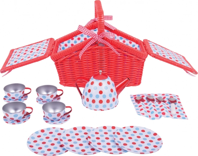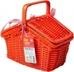Affascinante set da tè in un cestino di vimini rosso che offre il piacere del gioco. Include quattro tazze, piattini, una teiera con cucchiaini, ideale per i tè delle bambine a casa o in viaggio.