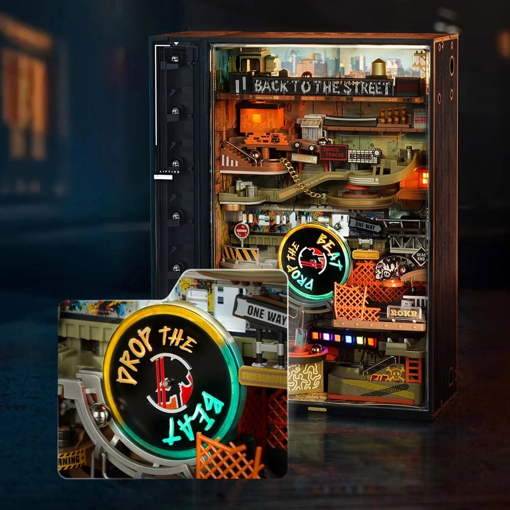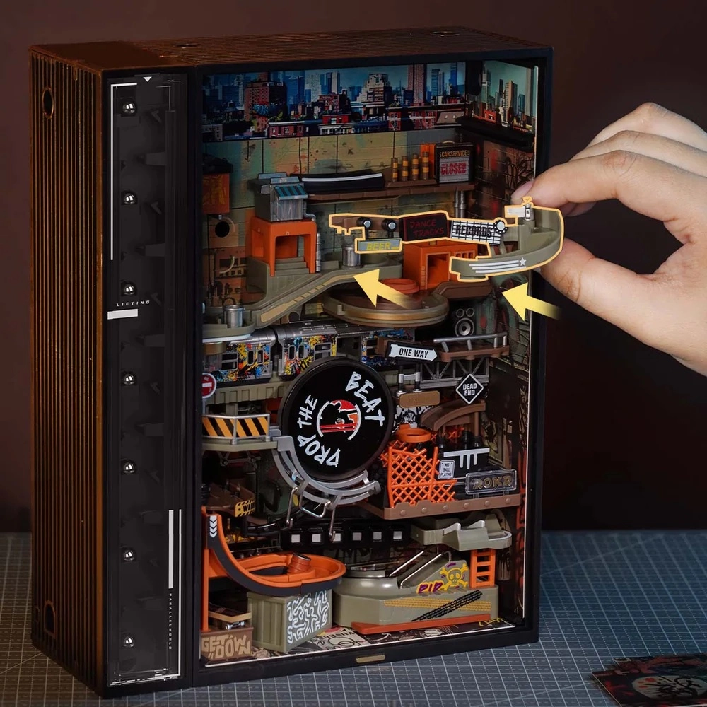 Un panorama in miniatura di una strada hip‑hop pulsante porta il movimento fluido delle biglie su una pista lunga 233 cm, esaltato da una dinamica illuminazione LED al neon. Grazie al motore efficiente ad alto torque, le biglie tornano in modo affidabile tramite l’ascensore automatico, per uno spettacolo continuo.
