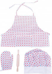 Offrite ai piccoli chef tutto ciò di cui hanno bisogno per le prime cotture e per un divertente gioco di cucina. Il leggero grembiule in tessuto a pois protegge i vestiti, il cappello da chef si adatta facilmente grazie alla chiusura a strappo e il mattarello in legno con formine in metallo stimola creatività e piacere di creare.