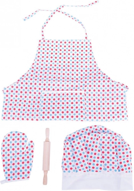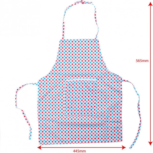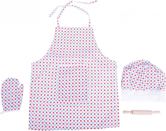Il piacevole grembiule con pois colorati protegge i vestiti sia durante il gioco sia nella vera cottura. Il cappello regolabile con chiusura a strappo si adatta facilmente alla circonferenza della testa e rimane comodo per tutto il giorno.