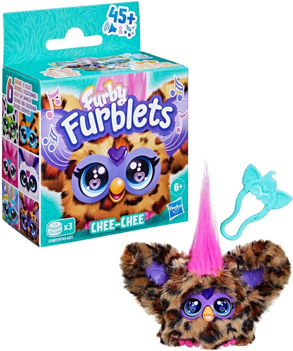 Furby Furblet Chee-Chee è un piccolo compagno di peluche con una grande personalità. Canta melodie originali, emette suoni divertenti e con il suo spirito buffo conquista bambini e adulti. Portalo con te in viaggio: la clip consente un facile fissaggio allo zaino o alla borsa.