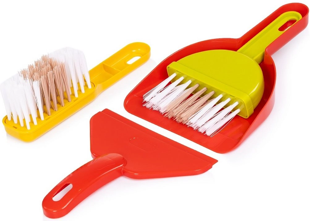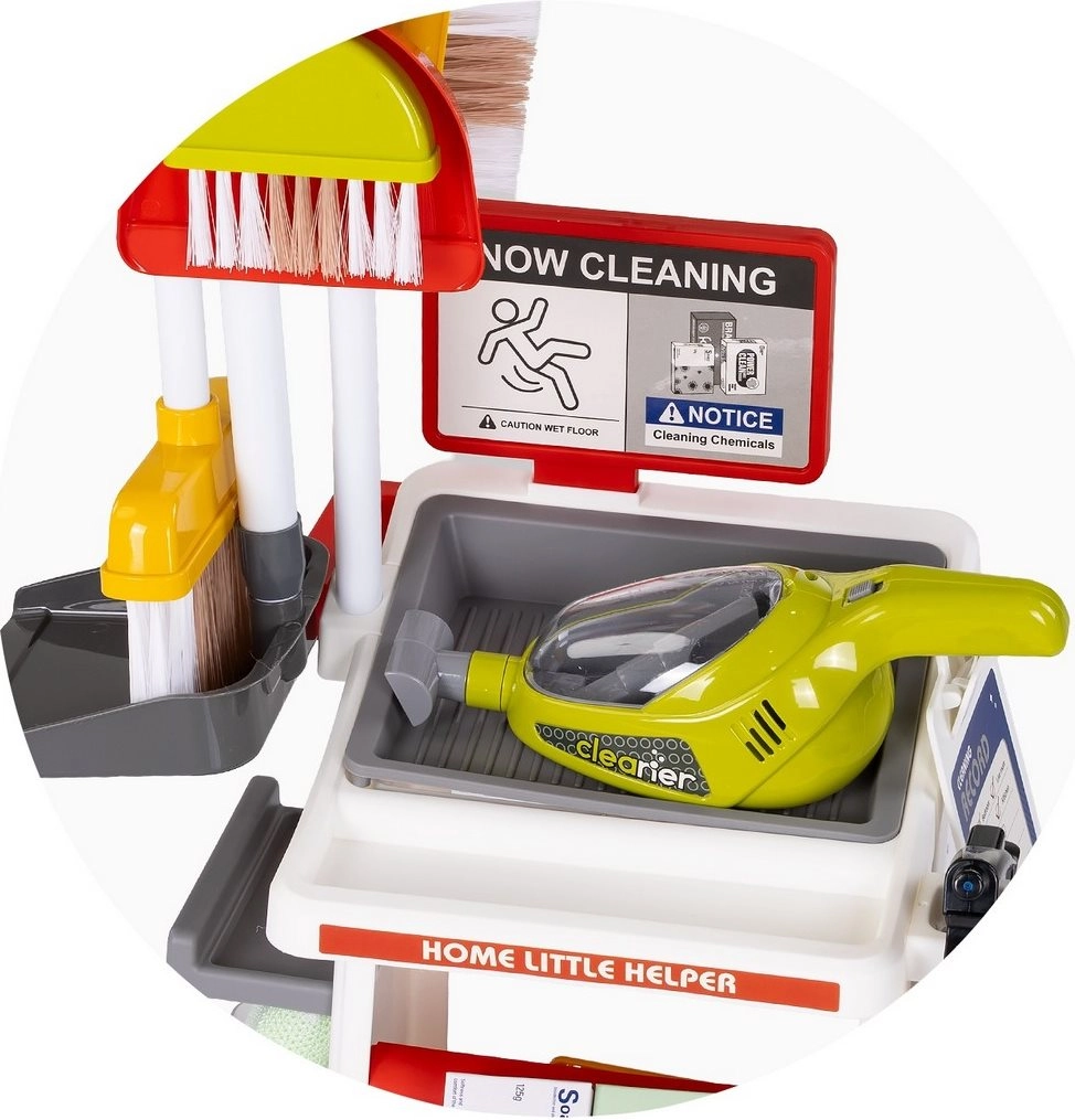 Il set comprende un’ampia gamma di accessori: aspirapolvere, mocio, scopa, spazzolino e paletta, spruzzatore, spugna e panni, eventualmente anche cartello di avviso e cestino. Tutto è adattato alle mani dei bambini per una presa sicura e un facile riposizionamento sul carrello. I materiali di qualità garantiscono una lunga durata anche con un uso frequente.
