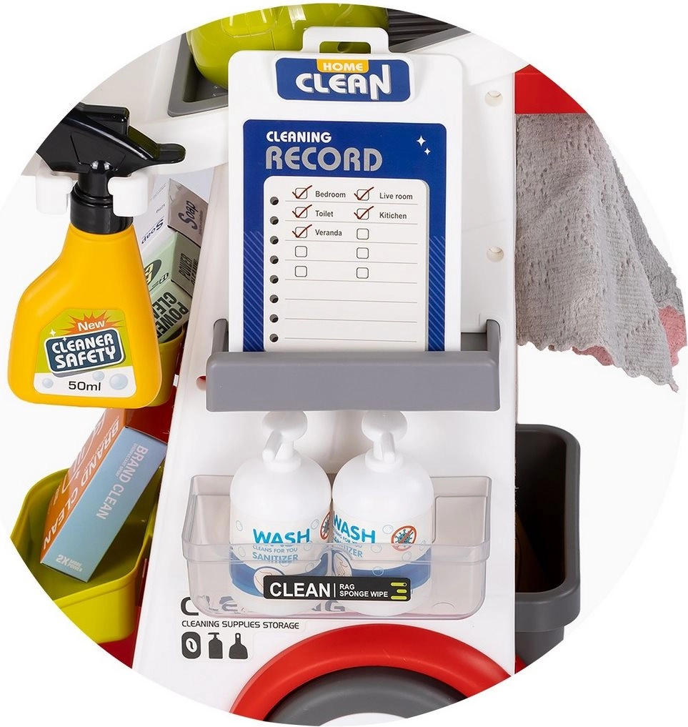 Il pratico carrello con ganci e ripiani contiene mocio, scopa, spazzolino, paletta e spruzzatore. I bambini imparano facilmente a organizzare e a rimettere tutto a posto dopo il gioco.