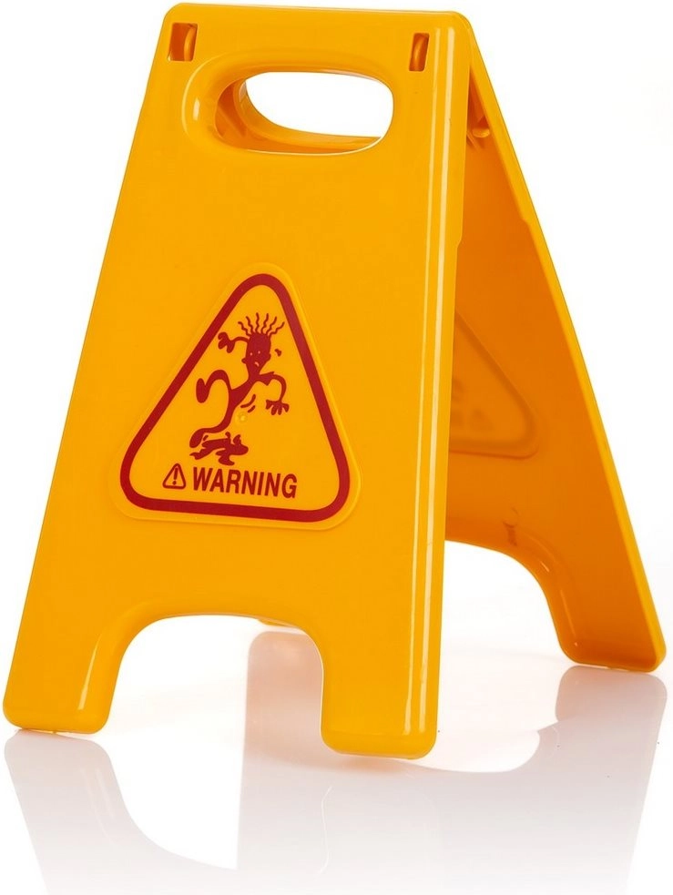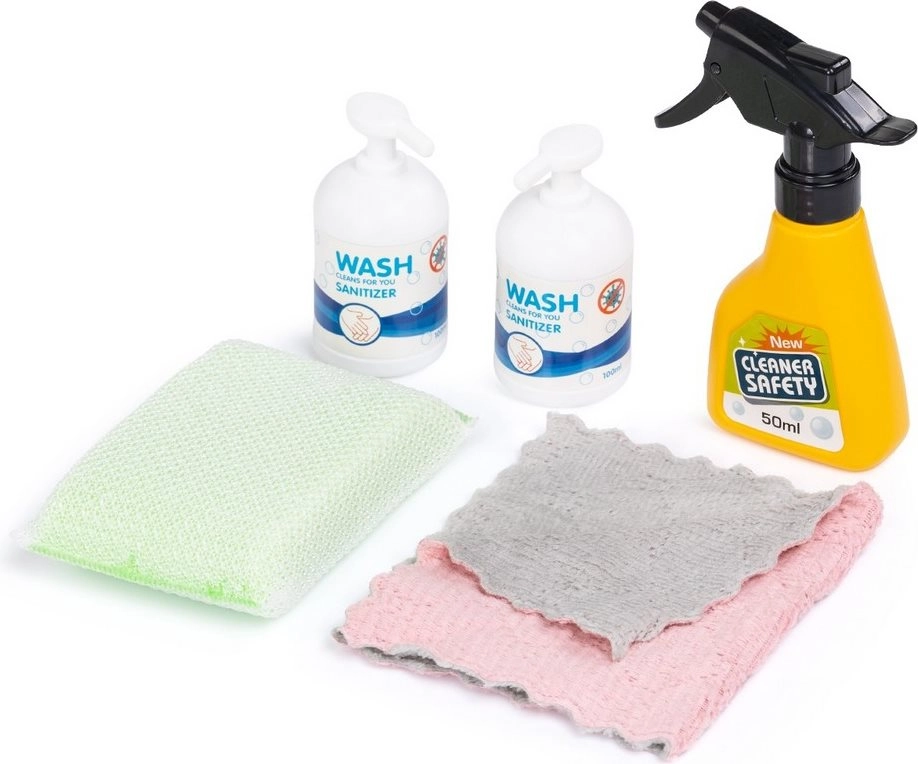 Il cartello di avviso e gli accessori per la “casa pulita” insegnano ai bambini la premura e i comportamenti sicuri durante le attività domestiche.