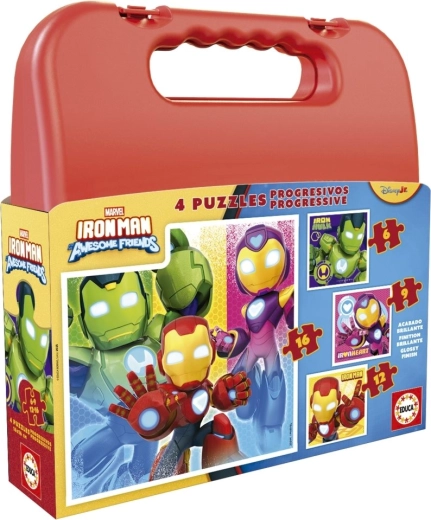 Un divertente set di quattro puzzle progressivi con il tema IRON MAN farà felici i piccoli fan dei supereroi. Ogni puzzle ha un numero diverso di pezzi (6, 9, 12 e 16), così i bambini possono aumentare gradualmente la difficoltà e sviluppare il pensiero logico, la pazienza e la motricità fine. La pratica valigetta in plastica facilita il trasporto e la conservazione.